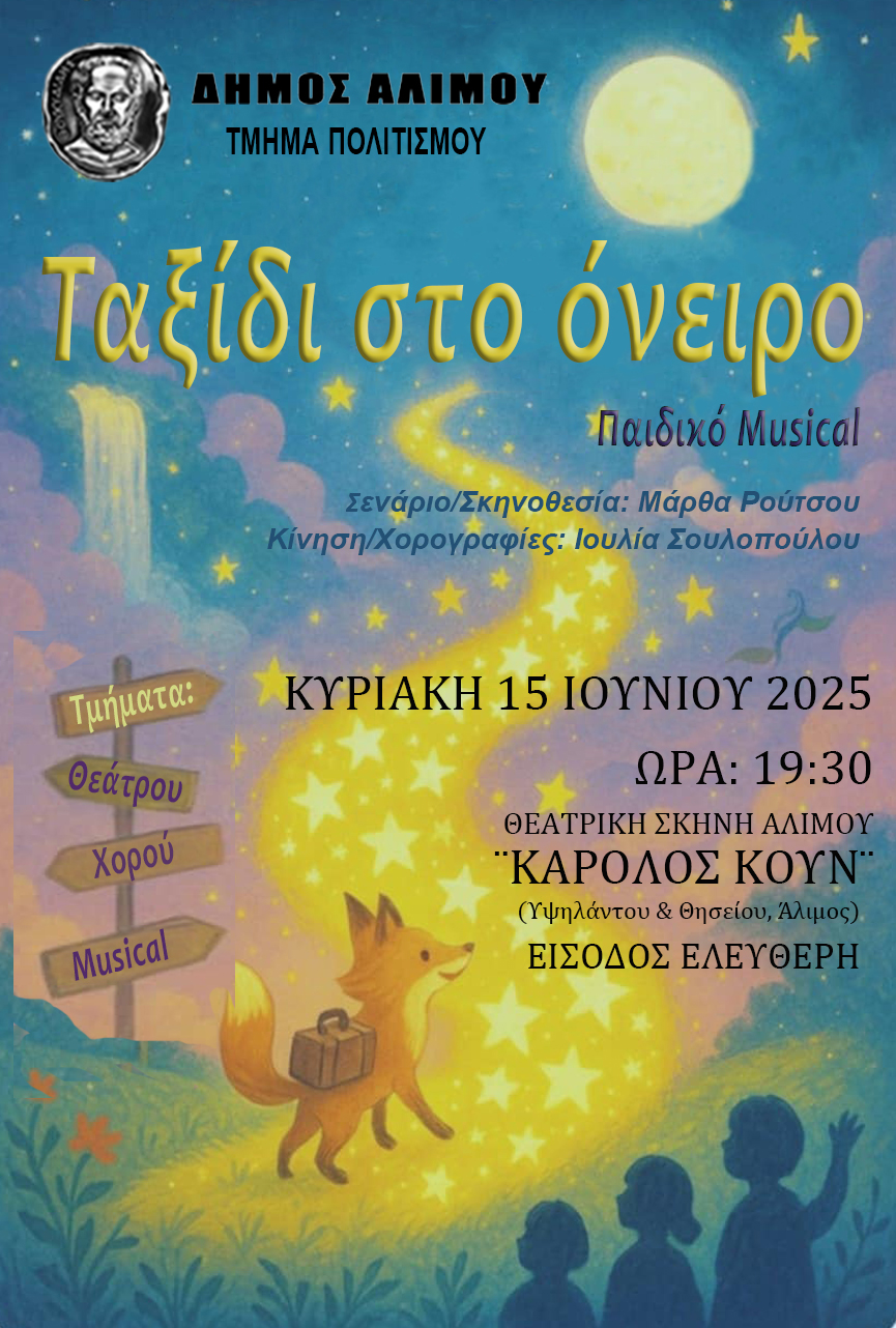 Το Τμήμα Πολιτισμού του Δήμου Αλίμου παρουσιάζει την παιδική θεατρική παράσταση με τίτλο «Ταξίδι στο όνειρο», την Κυριακή 15 Ιουνίου 2025, στις 19:30, στη Θεατρική Σκηνή Αλίμου «Κάρολος Κουν».
