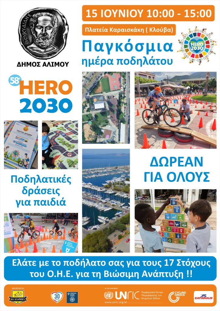 Ο Δήμος Αλίμου γιορτάζοντας την Παγκόσμια Ημέρα Ποδηλάτου, διοργανώνει την αθλητική εκδήλωση «HERO 2030 BIKE FESTIVAL», την Κυριακή 15 Ιουνίου 2025, στην Πλατεία Καραϊσκάκη (Κλούβα), από τις 10:00 το πρωί μέχρι τις 3 το μεσημέρι.