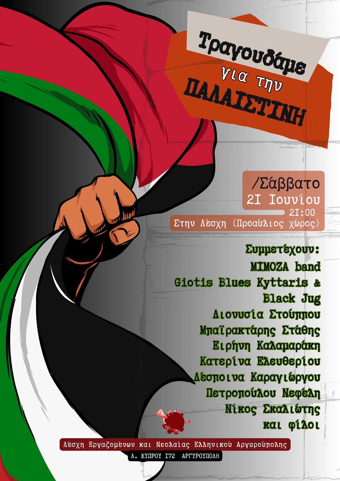 Η Λέσχη Εργαζομένων και Νεολαίας Ελληνικού Αργυρούπολης διοργανώνει μία Συναυλία Αλληλεγγύης προς τον Παλαιστινιακό Λαό, με τίτλο «Φωνή για την Παλαιστίνη».