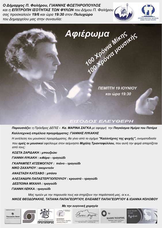 Με αφορμή την Παγκόσμια Ημέρα του Πατέρα, ο Δήμος Παλαιού Φαλήρου και η Επιτροπή Ισότητας των Φύλων του Δήμου διοργανώνει ένα μουσικό αφιέρωμα «100 Χρόνια Μίκης,100 Χρόνια μουσικής».
