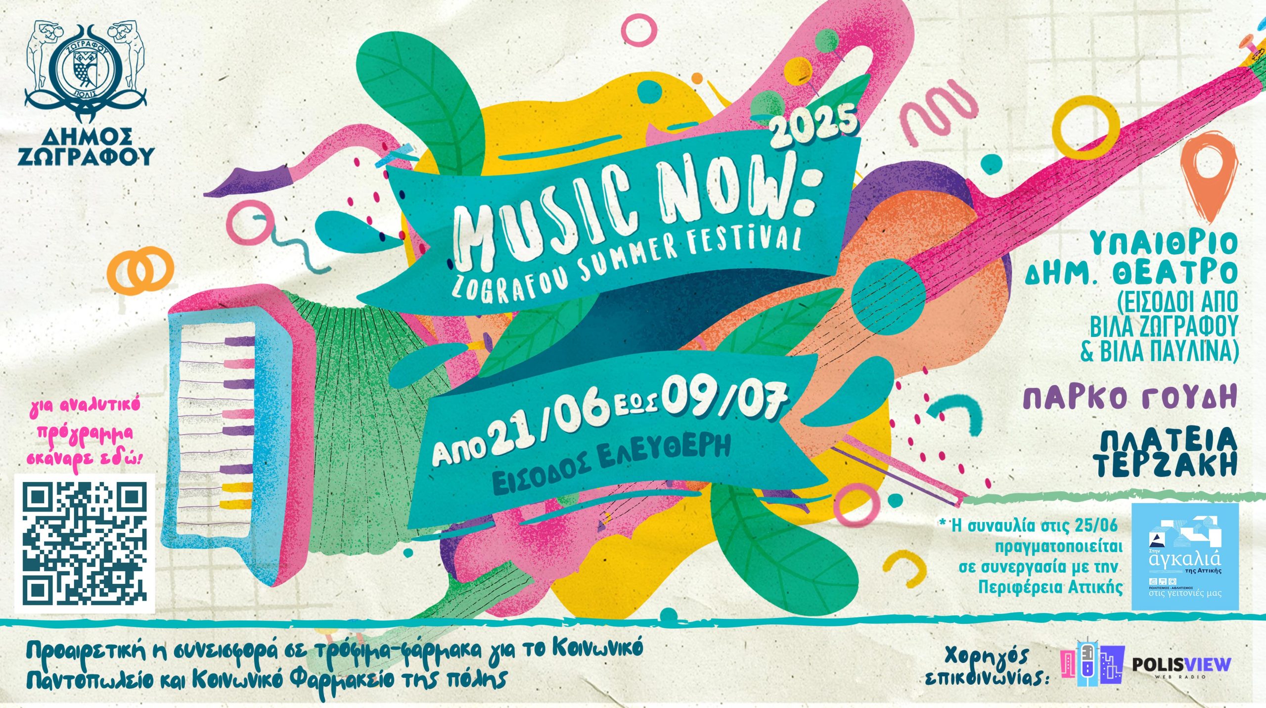 Το επιτυχημένο καλοκαιρινό φεστιβάλ μουσικής «Music Now! Ζωγράφου Summer Festival» έρχεται και φέτος στο Δήμο Ζωγράφου.