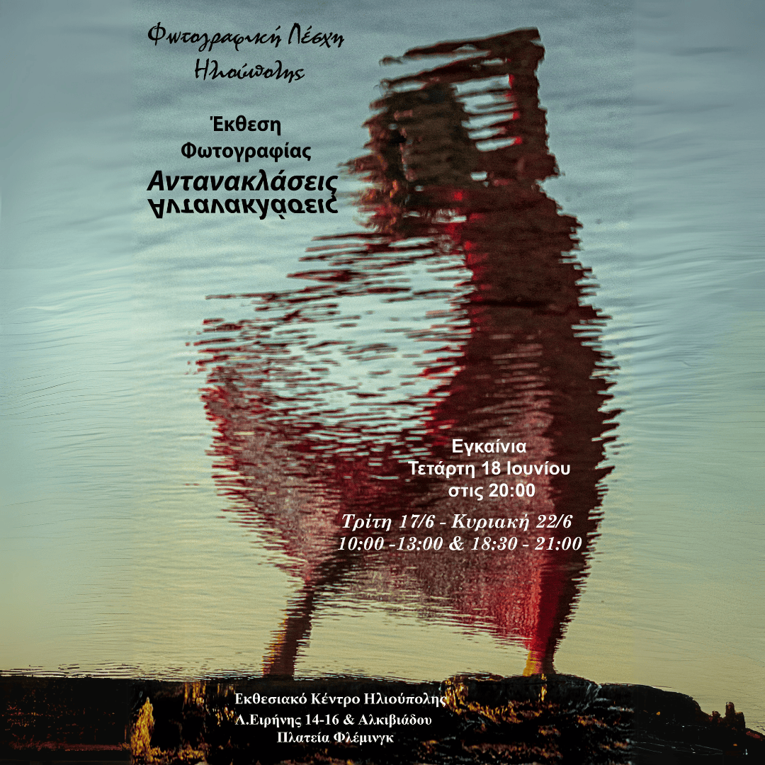 Η Φωτογραφική Λέσχη Ηλιούπολης διοργανώνει μία ιδιαίτερα ενδιαφέρουσα έκθεση φωτογραφίας με θέμα «Αντανακλάσεις» από την Τρίτη 17 Ιουνίου έως την Κυριακή 22 Ιουνίου 2025 στο Εκθεσιακό Κέντρο του Δήμου Ηλιούπολης (Λεωφόρος Ειρήνης 14-16 & Αλκιβιάδου στην πλατεία Φλέμινγκ).