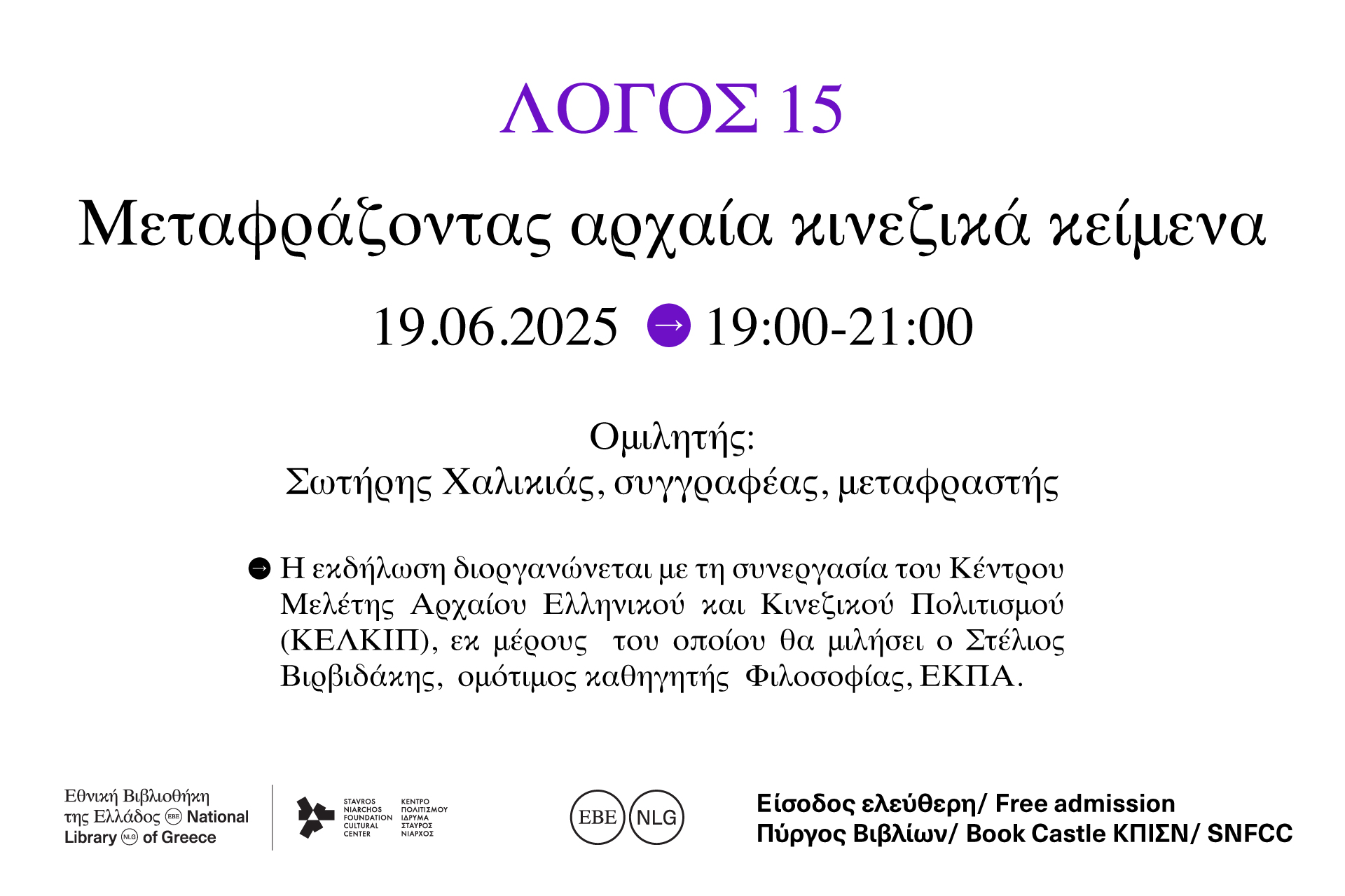Η δεύτερη εκδήλωση έχει τίτλο «Μεταφράζοντας αρχαία κινεζικά κείμενα» και θα πραγματοποιηθεί την Πέμπτη 19 Ιουνίου 2025, 19:00 έως 21:00, στον Πύργο Βιβλίων της Εθνικής Βιβλιοθήκης της Ελλάδος, στο Κέντρο Πολιτισμού Ίδρυμα Σταύρος Νιάρχος.