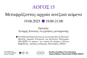 Η Εθνική Βιβλιοθήκη της Ελλάδος συνεχίζει τον κύκλο εκδηλώσεων «Λόγος 15» που επιμελείται ο Πρόεδρος του Εφορευτικού Συμβουλίου της Εθνικής Βιβλιοθήκης της Ελλάδος, Σταύρος Ζουμπουλάκης.