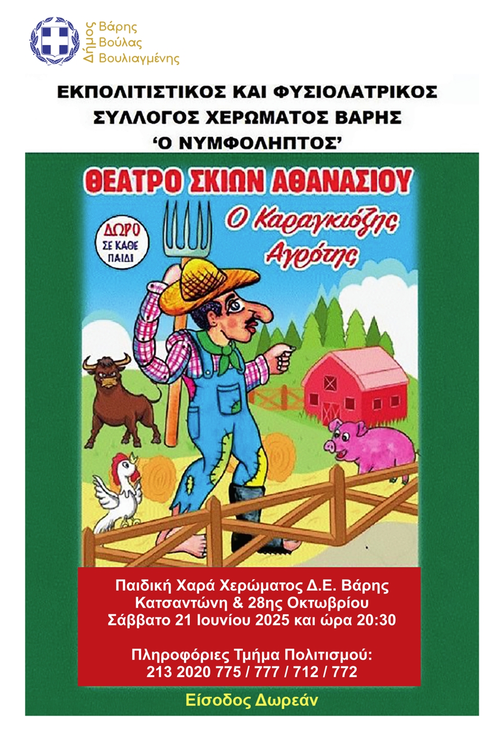 Ο Δήμος Βάρης Βούλας Βουλιαγμένης και ο Εκπολιτιστικός και Φυσιολατρικός Σύλλογος Χερώματος Βάρης «O ΝΥΜΦΟΛΗΠΤΟΣ» συνδιοργανώνουν παράσταση, με το θέατρο σκιών του Γιώργου Αθανασίου στο έργο «Ο Καραγκιόζης αγρότης».