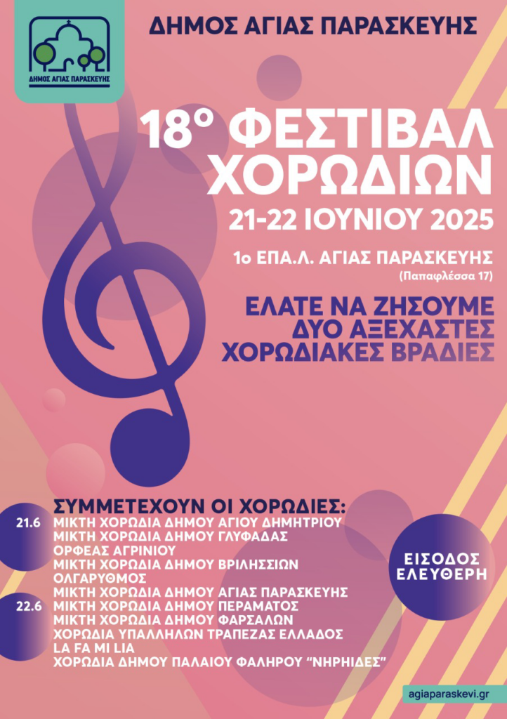 Με αφορμή την Παγκόσμια Ημέρα Μουσικής, που γιορτάζεται στις 21 Ιουνίου, χορωδιακά σχήματα από όλη την Ελλάδα συμμετέχουν σε ένα διήμερο Φεστιβάλ Χορωδιών του Δήμου Αγίας Παρασκευής, που θα πραγματοποιηθεί το Σαββατοκύριακο 21 και 22 Ιουνίου 2025, στο 1ο ΕΠΑΛ της πόλης.