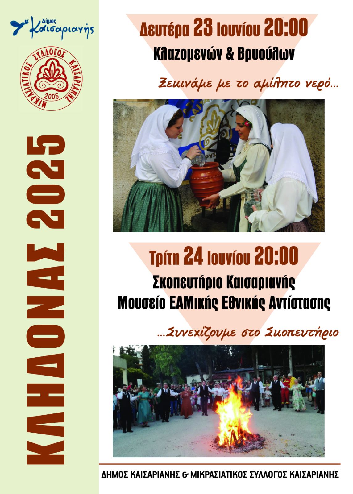 Ο Μικρασιατικός Σύλλογος Καισαριανής και o Δήμος Καισαριανής αναβιώνουν και φέτος τον παραδοσιακό Κλήδονα, με ένα διήμερο εκδηλώσεων.