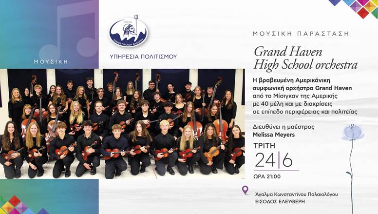 Ο Δήμος Παλαιού Φαλήρου και η Υπηρεσία Πολιτισμού διοργανώνουν μία εκδήλωση με την βραβευμένη Αμερικάνικη συμφωνική ορχήστρα Grand Haven High School Orchestra, από το Μίσιγκαν της Αμερικής, με 40 μέλη και με διακρίσεις σε επίπεδο περιφέρειας και πολιτείας. Την ορχήστρα διευθύνει η μαέστρος, Melissa Meyers.