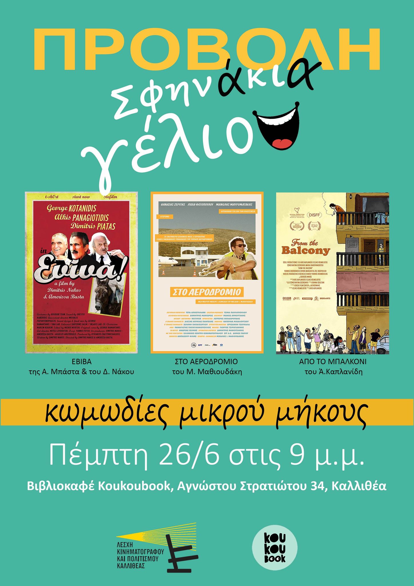 Η Λέσχη Κινηματογράφου και Πολιτισμού Καλλιθέας και το βιβλιοπωλείο Koukoubook προβάλλουν σήμερα, Πέμπτη 26 Ιουνίου, κωμωδίες μικρού μήκους στην όμορφη ταράτσα του βιβλιοπωλείου (Αγν, Στρατιώτου 34, Καλλιθέα).