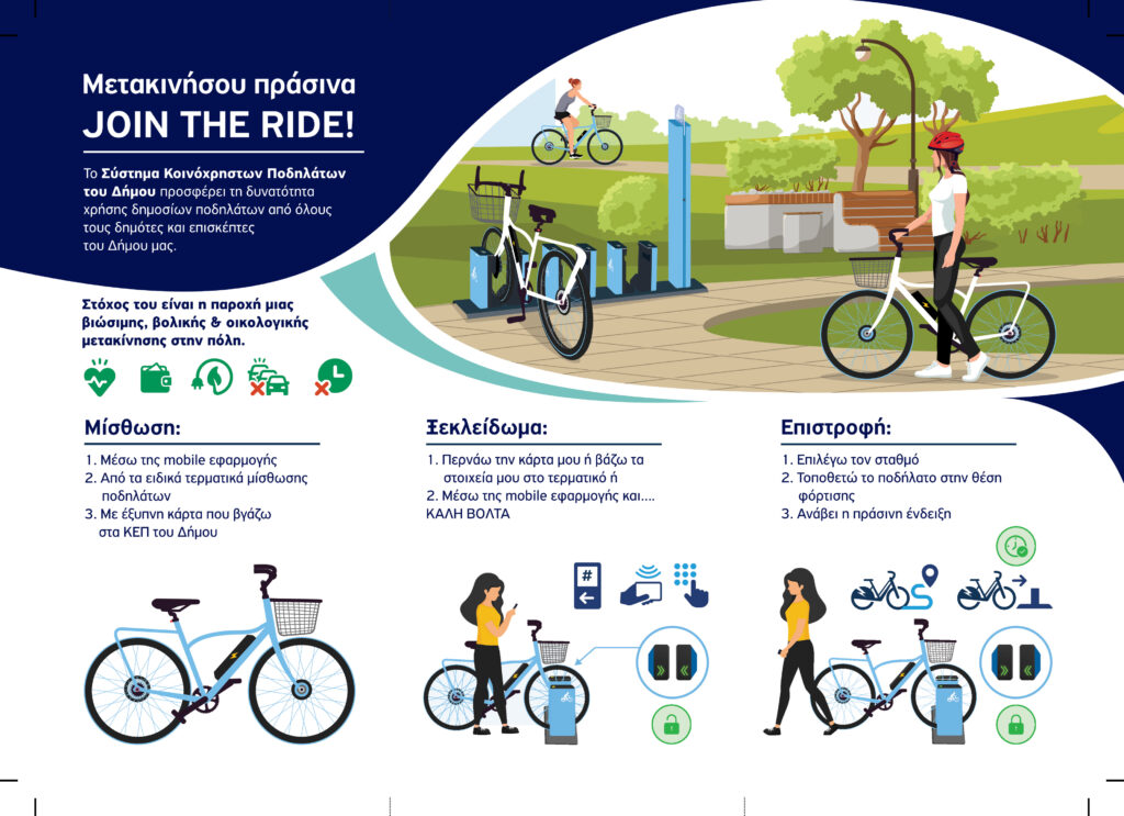 Α. Με τη χρήση της εφαρμογής (app) “e-bike sharing” στο κινητό του χρήστη, η οποία προσφέρεται δωρεάν από το PlayStore ή από το AppleStore. Όταν ο χρήστης θέλει να χρησιμοποιήσει ένα ποδήλατο, απλά σαρώνει (scan) τον κωδικό QR που βρίσκεται στο ποδήλατο. Η θέση κλειδώματος ξεκλειδώνει το ποδήλατο και αρχίζει η χρήση. Η χρήση της εφαρμογής είναι αυστηρά προσωπική.