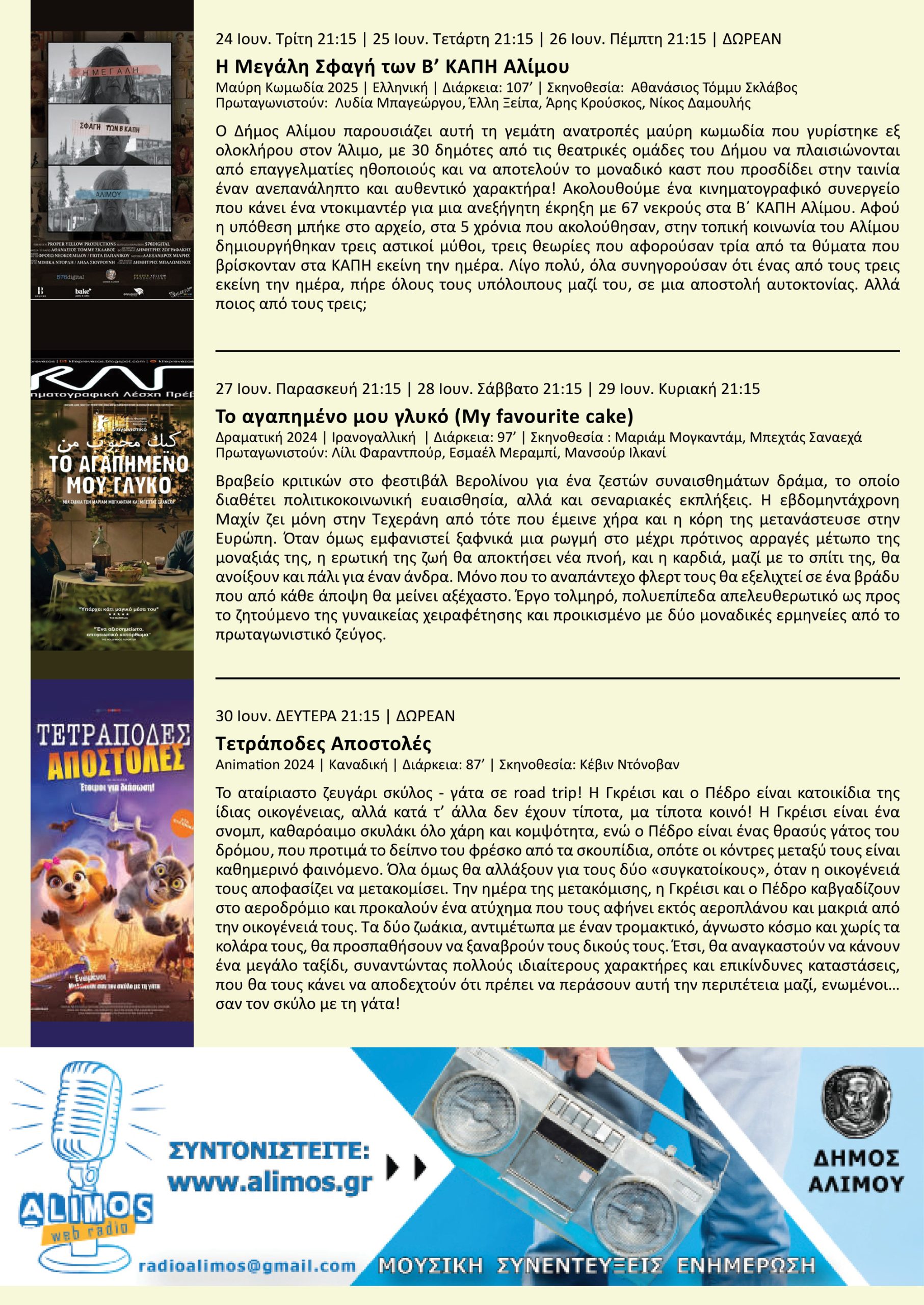 Ο θερινός κινηματογράφος CineAlimos λειτουργεί κάθε καλοκαίρι στον παραλιακό χώρο του Δήμου Αλίμου.