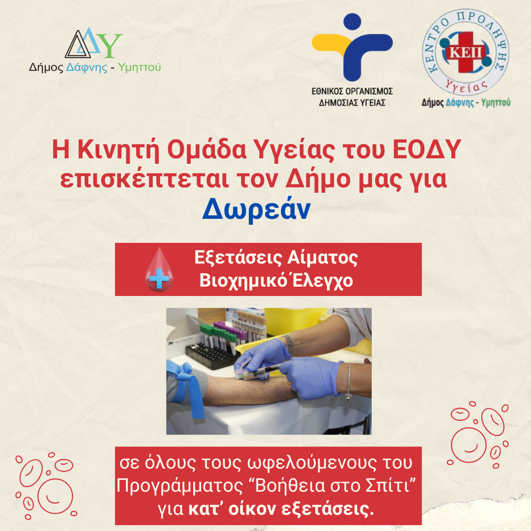 Ο Δήμος Δάφνης-Υμηττού ενισχύει τις παροχές πρόληψης και φροντίδας υγείας προς τους δημότες, μέσα από τη δράση της Κινητής Ομάδας Υγείας (ΚΟΜΥ).