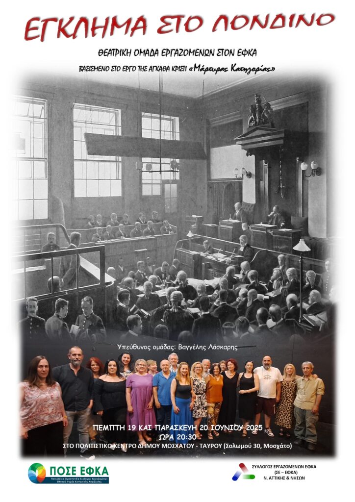 Η θεατρική παράσταση «Έγκλημα στο Λονδίνο», από τον Σύλλογο Εργαζομένων ΕΦΚΑ Ν. Αττικής και Νήσων (ΣΕ-ΕΦΚΑ), παρουσιάζεται, ύστερα από προηγούμενη αναβολή της, σήμερα, Τρίτη 1η Ιουλίου 2025 και ώρα 20.30,στο Πολιτιστικό Κέντρο «Θεόδωρος Αγγελόπουλος», στο Μοσχάτο (Σολωμού 30, Μοσχάτο 183 45).