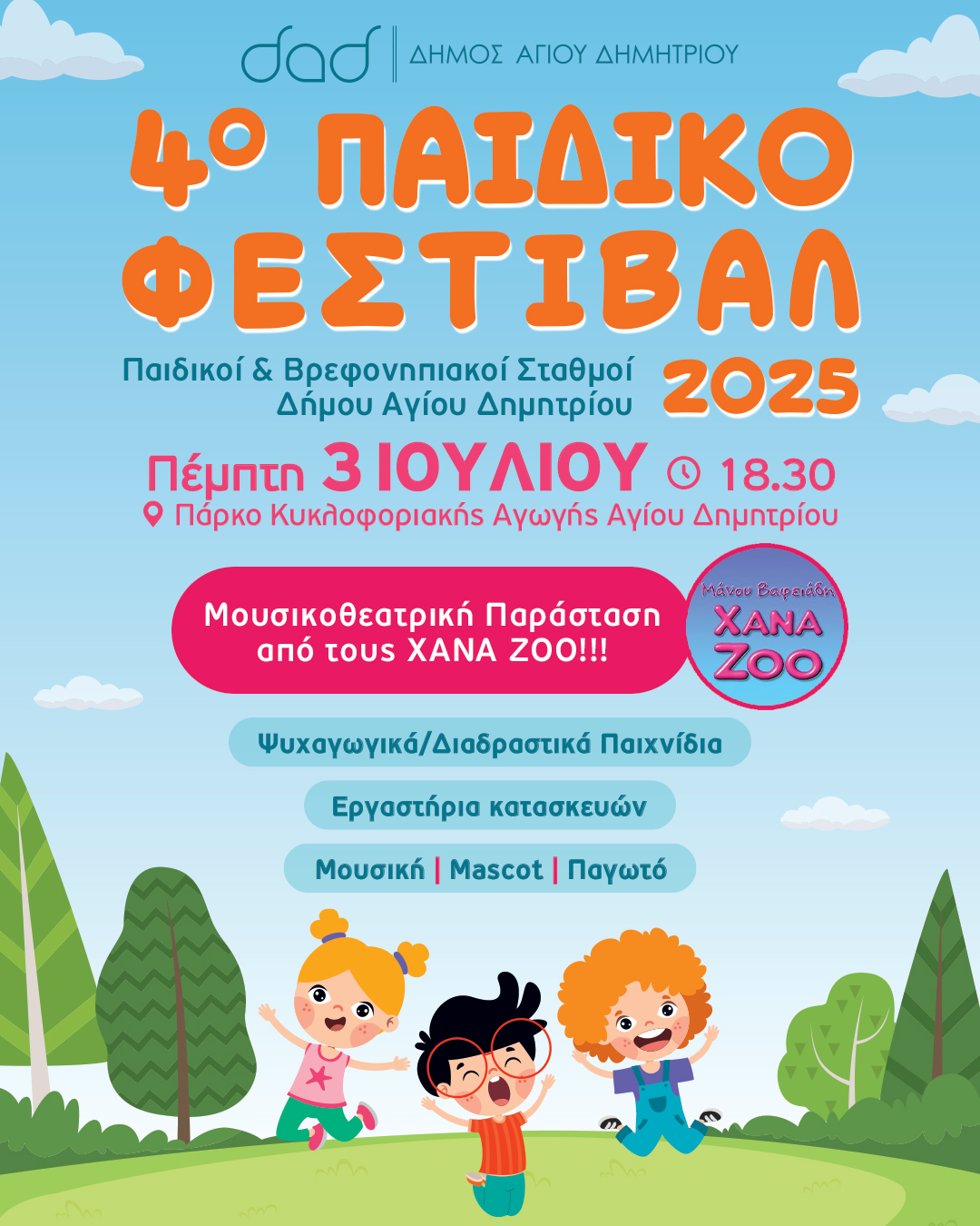 Την Πέμπτη 3 Ιουλίου 2025 και ώρα 18:30, οι Παιδικοί & Βρεφονηπιακοί Σταθμοί της πόλης, οργανώνουν -για τα παιδιά των σταθμών- το 4ο Παιδικό Φεστιβάλ Σταθμών, που ήταν προγραμματισμένο την Παρασκευή 27 Ιουνίου, αλλά αναβλήθηκε λόγω καύσωνα!