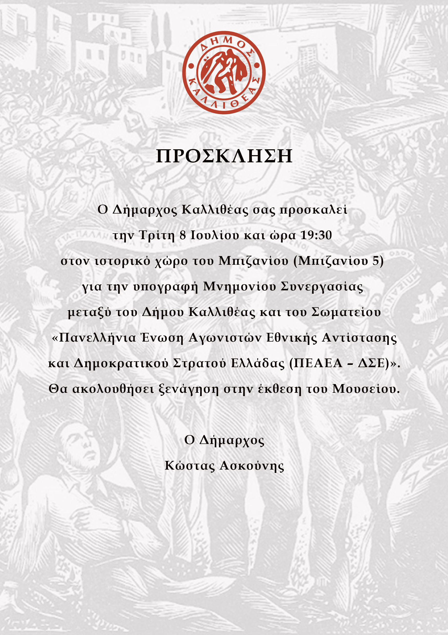 Την Τρίτη 8 Ιουλίου και ώρα 19:30, στον ιστορικό χώρο του Μπιζανίου (Μπιζανίου 5), θα λάβει χώρο η υπογραφή Μνημονίου Συνεργασίας μεταξύ του Δήμου Καλλιθέας και του Σωματείου «Πανελλήνια Ένωση Αγωνιστών Εθνικής Αντίστασης και Δημοκρατικού Στρατού Ελλάδας (ΠΕΑΕΑ – ΔΣΕ)».