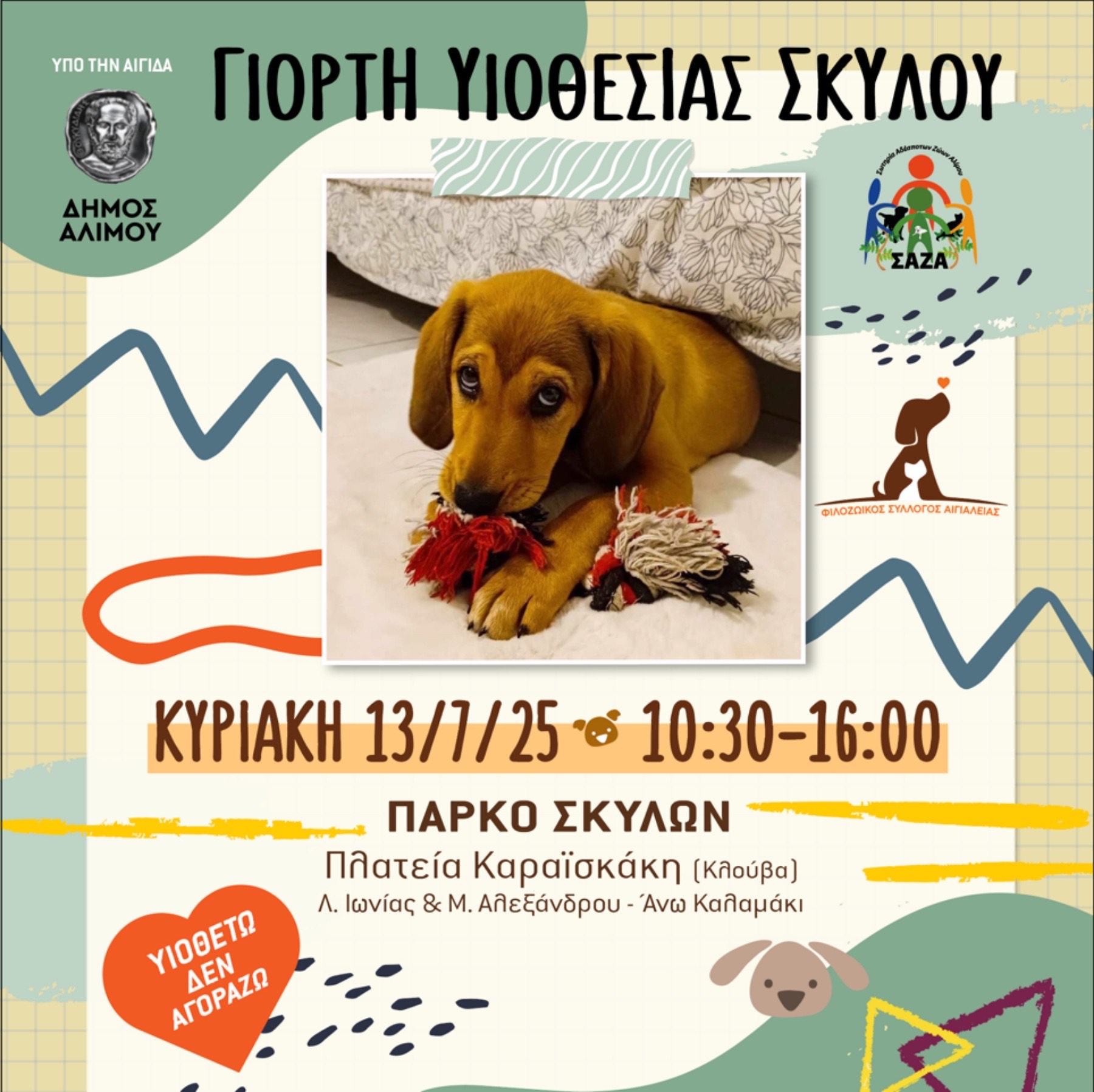 Για αυτόν τον λόγο, την Κυριακή 13 Ιουλίου 2025 στο Άνω Καλαμάκι, το φιλοζωικό σωματείο ΣΑΖΑ διοργανώνει υπό την αιγίδα του Δήμου Αλίμου και με τη στήριξη του Φιλοζωικού Γραφείου του Δήμου, μία Γιορτή Υιοθεσίας Σκύλου.