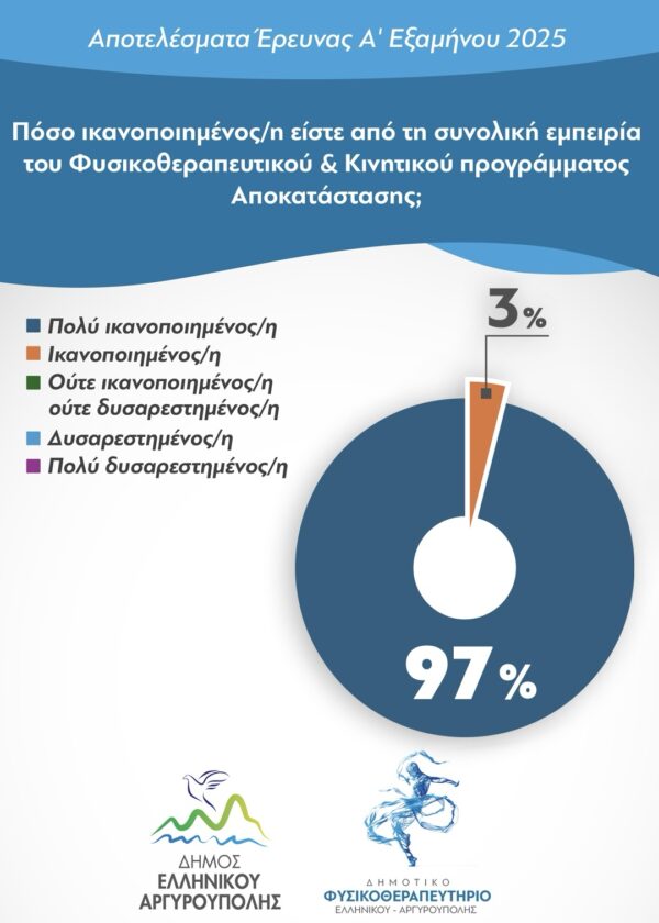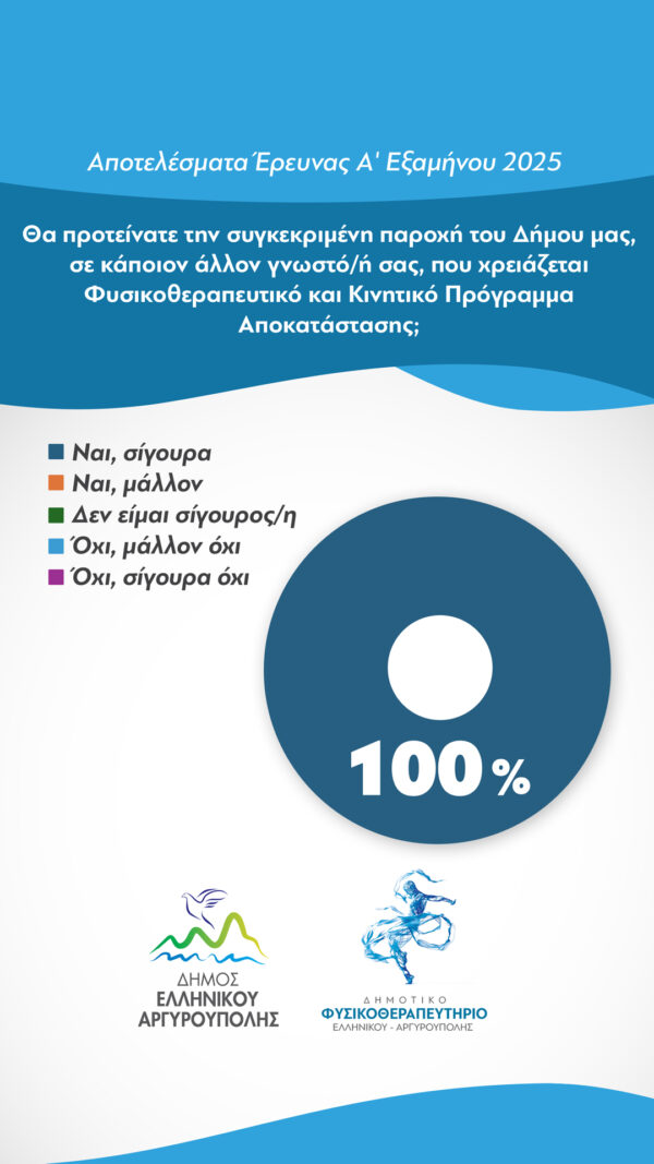 - Το 97% δήλωσε πολύ ικανοποιημένο από τη συνολική εμπειρία του Φυσικοθεραπευτικού και του Κινητικού Προγράμματος Αποκατάστασης.