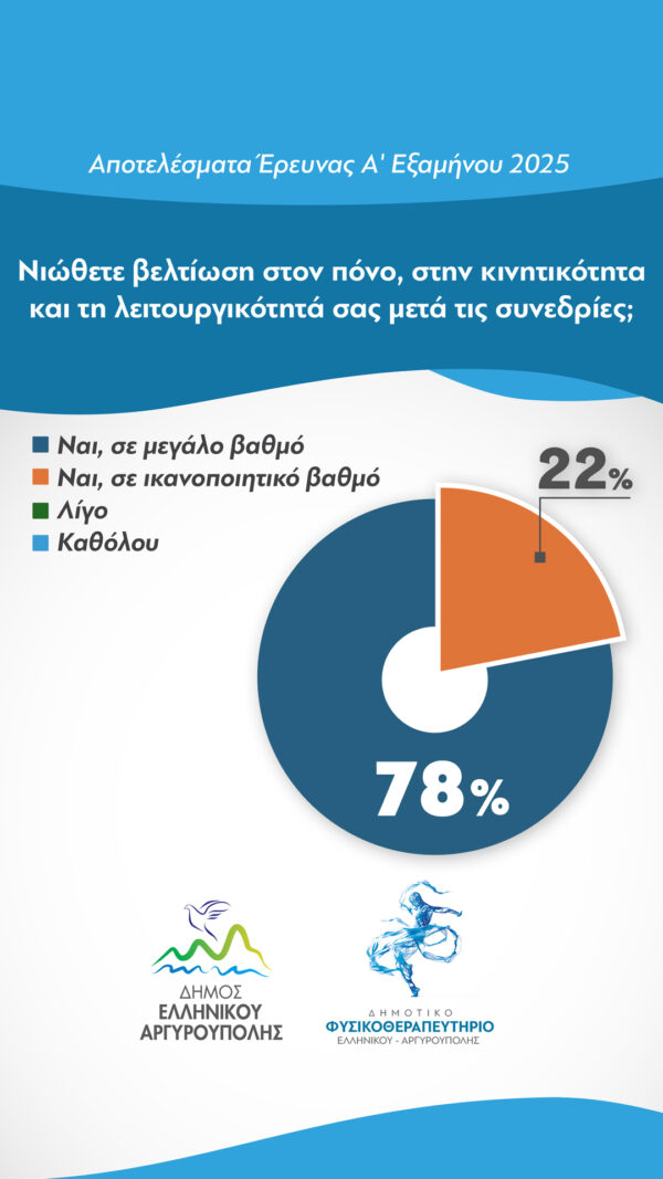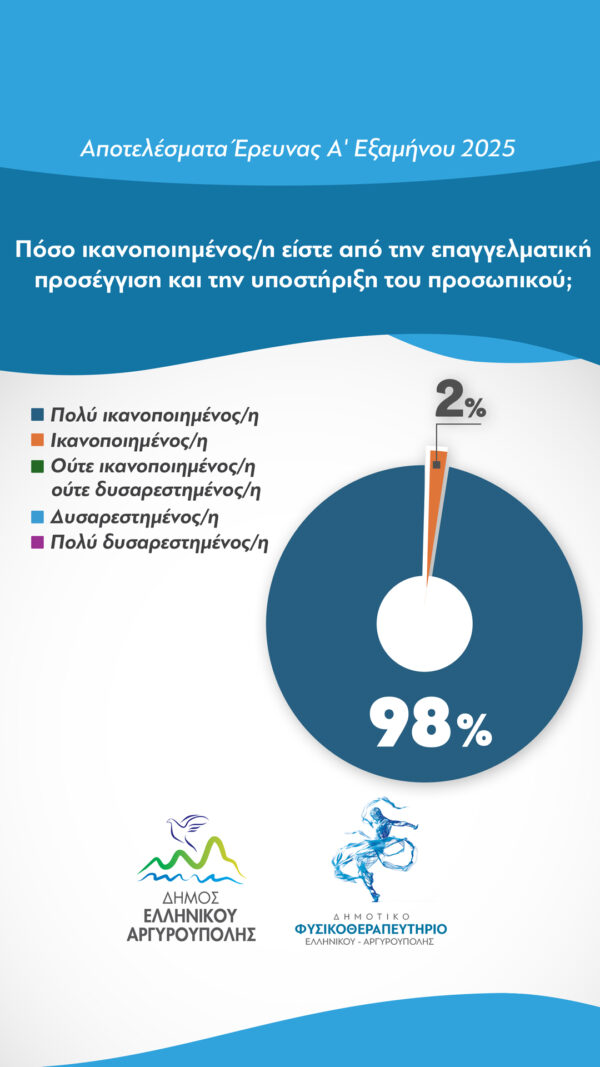 Η Κοινωνική Υπηρεσία του Δήμου Ελληνικού – Αργυρούπολης, στο πλαίσιο της αξιολόγησης της νέας δομής, μοίρασε ανώνυμα ερωτηματολόγια στους ωφελούμενους του Δημοτικού Φυσικοθεραπευτηρίου από τα οποία προέκυψαν τα εξής αποτελέσματα: