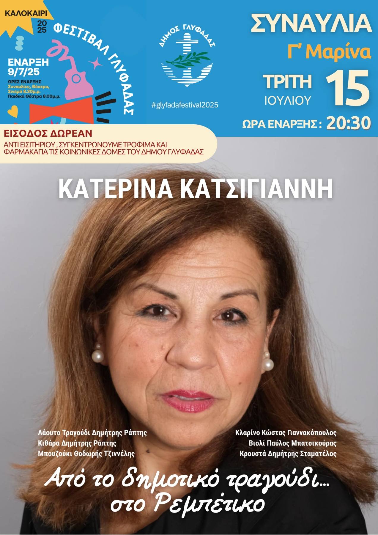 Το Φεστιβάλ Γλυφάδας 2025 συνεχίζεται, με την Κατερίνα Κατσίγιαννη να έρχεται σήμερα, Τρίτη 15 Ιουλίου και ώρα 8:30 μ.μ. στη Γ΄ Μαρίνα Γλυφάδας για ένα γνήσιο λαϊκό δημοτικό γλέντι με πολυαγαπημένα διαχρονικά τραγούδια.