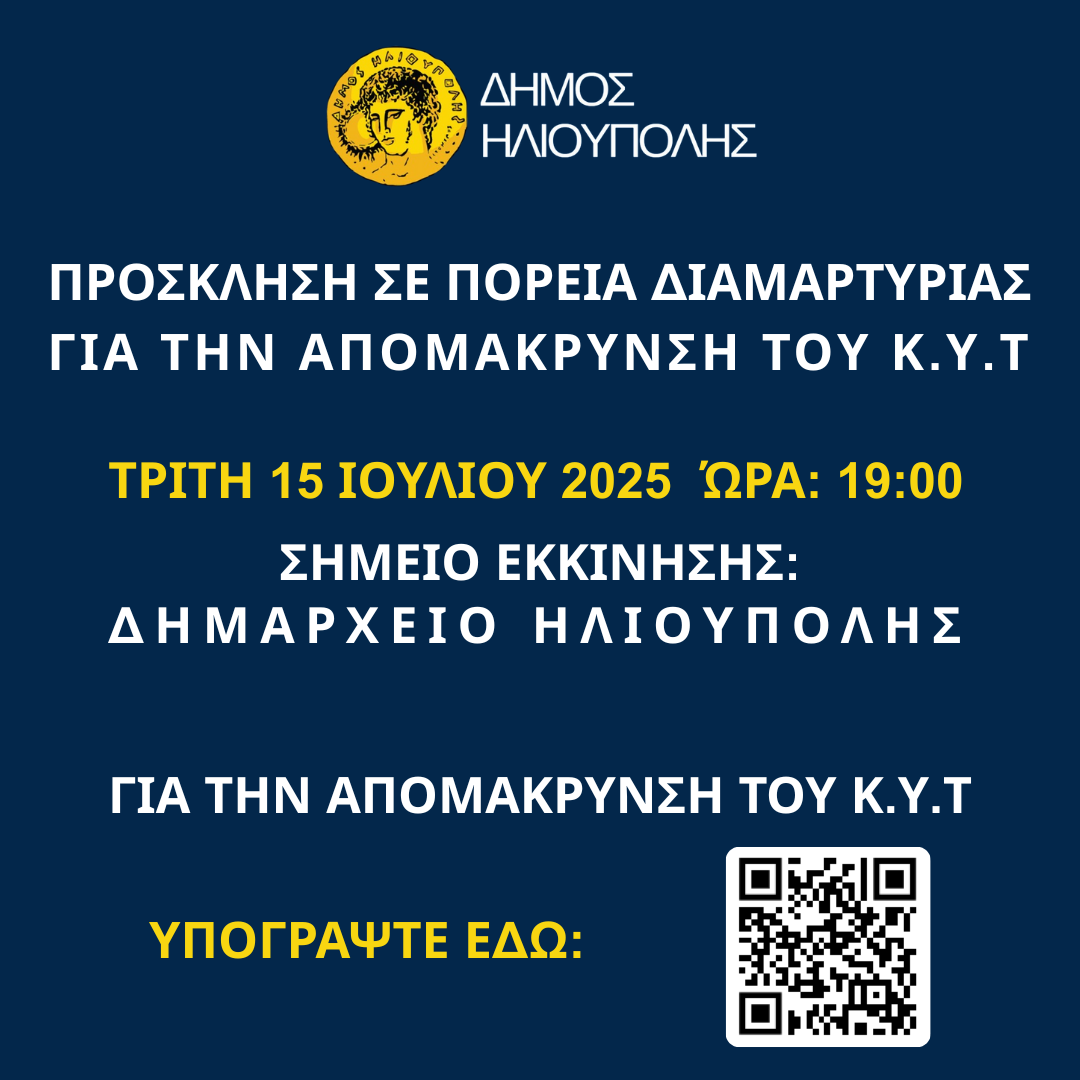 Ο Δήμος Ηλιούπολης καλεί όλους τους πολίτες να συμμετάσχουν στην πορεία διαμαρτυρίας για την απομάκρυνση του Κ.Υ.Τ (Κέντρο Υπερυψηλής Τάσης), που θα διεξαχθεί σήμερα, Τρίτη 15 Ιουλίου 2025 και θα ξεκινήσει στις 19:00 μ.μ. από το Δημαρχείο Ηλιούπολης.