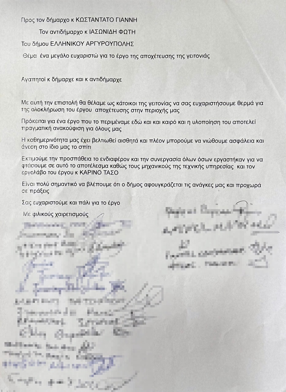 Επιπλέον, οι κάτοικοι της περιοχής απέστειλαν επιστολή ευχαριστιών προς τη Δημοτική Αρχή, επιβεβαιώνοντας την ανακούφιση και την ικανοποίηση των δημοτών για την επίλυση ενός τόσο σοβαρού ζητήματος.
