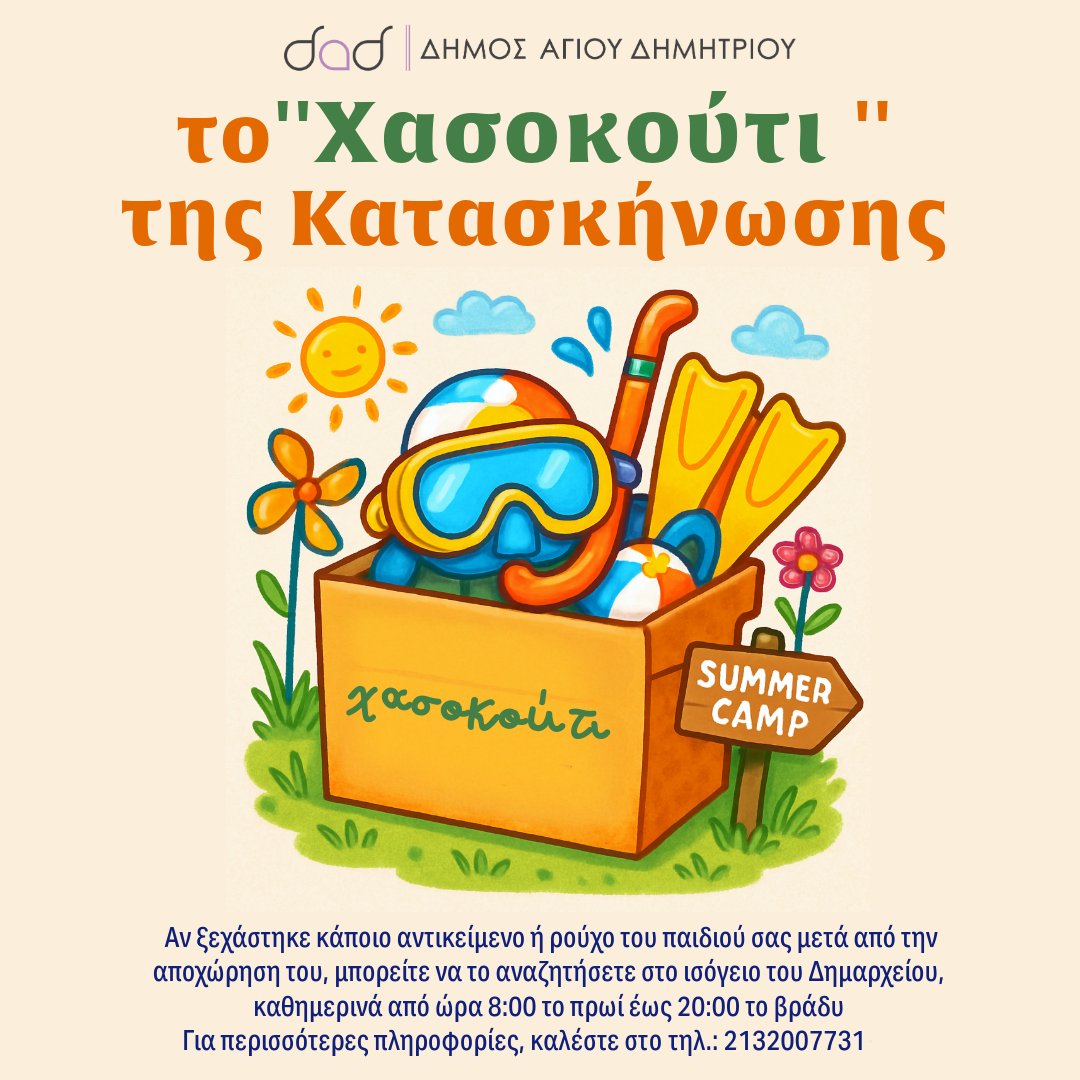 Όπως κάθε χρόνο, έτσι και φέτος το «Χασοκούτι της Κατασκήνωσης» βρίσκεται στο Δημαρχείο του Δήμου Αγίου Δημητρίου (Λεωφ. Αγίου Δημητρίου 55).