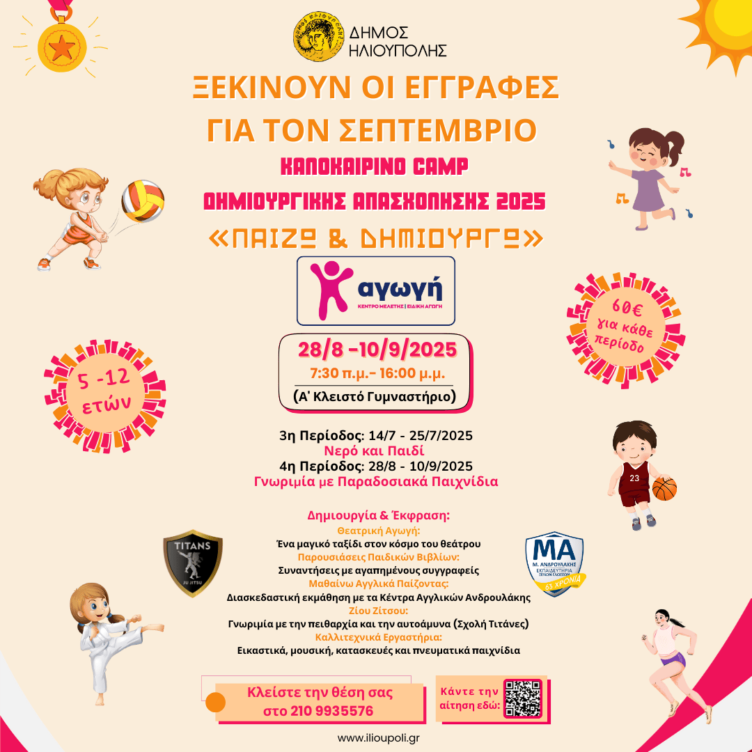 Ο Δήμος Ηλιούπολης, σε συνεργασία με την Εκπαιδευτική αλυσίδα «ΑΓΩΓΗ», τη μεγαλύτερη αλυσίδα Κέντρων Μελέτης και Ειδικής Αγωγής στα Νότια Προάστια, διοργανώνει το φετινό Καλοκαιρινό Camp δημιουργικής απασχόλησης «Παίζω και Δημιουργώ», σχεδιασμένο για παιδιά 6-12 ετών, με στόχο την ανάπτυξη της δημιουργικότητας και των δεξιοτήτων.