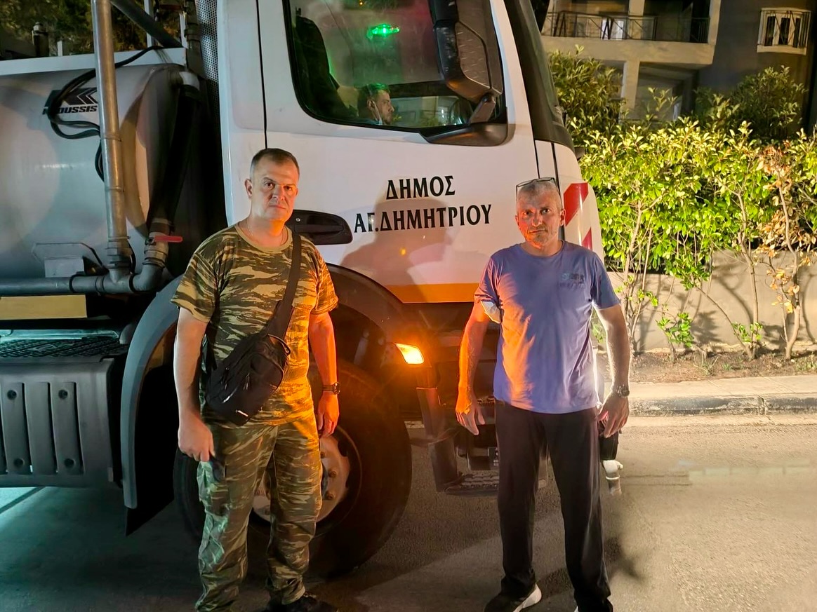 Στο σημείο προσήλθε και ο Αντιδήμαρχος Καθαριότητας & Κυκλικής Οικονομίας Βαγγέλης Μαλαθούνης, ο οποίος συνέβαλε καθοριστικά, διασφαλίζοντας τη διάθεση της υδροφόρας.