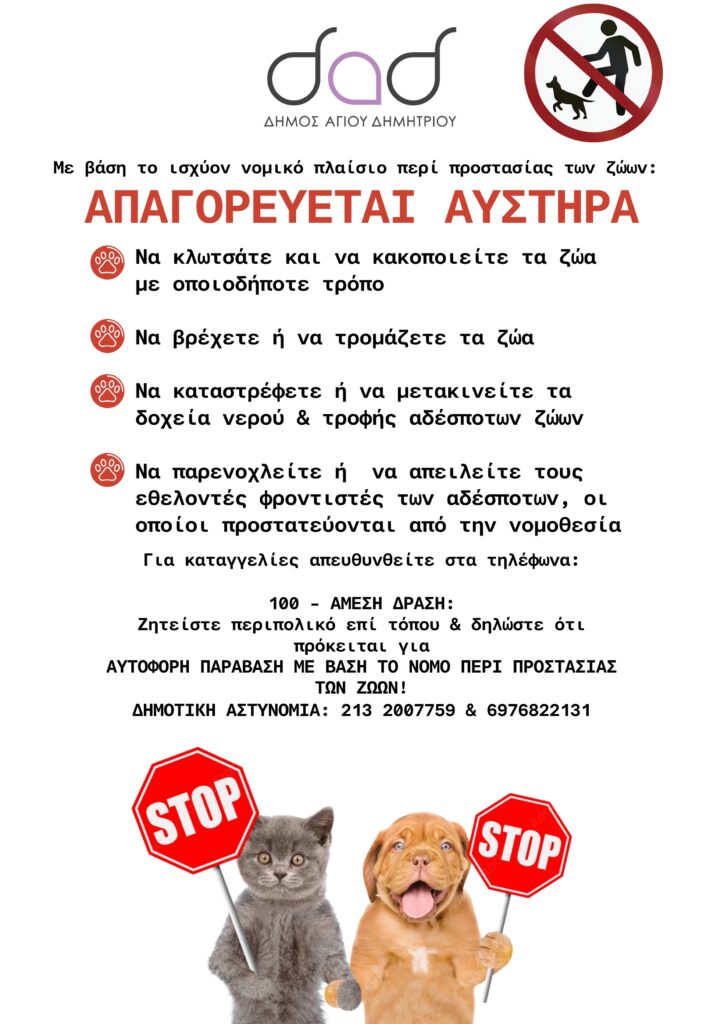 Το τελευταία διάστημα παρατηρήθηκαν, όπως αναφέρει σε ανακοίνωσή του ο Δήμος Αγίου Δημητρίου, περιστατικά απομάκρυνσης ή καταστροφής δοχείων τροφής και νερού για αδέσποτα, σε διαφορά σημεία της πόλης μας. Με αφορμή τα περιστατικά αυτά αλλά και τις εντάσεις που- κατά καιρούς- δημιουργούνται, ανάμεσα σε πολίτες και φιλόζωους που ασχολούνται με τη σίτιση τους, το Τμήμα Αστικής Πανίδας εξέδωσε σχετικό ενημερωτικό φυλλάδιο. Στο έντυπο αυτό, τονίζει στην ανακοίνωσή του ο Δήμος, αναφέρονται οι υποχρεώσεις όλων μας, οι οποίες απορρέουν από τη νομοθεσία, τόσο απέναντι στα ζώα όσο και απέναντι στους φιλόζωους.