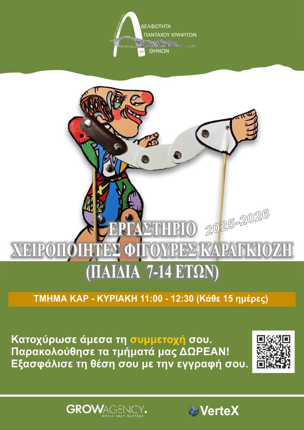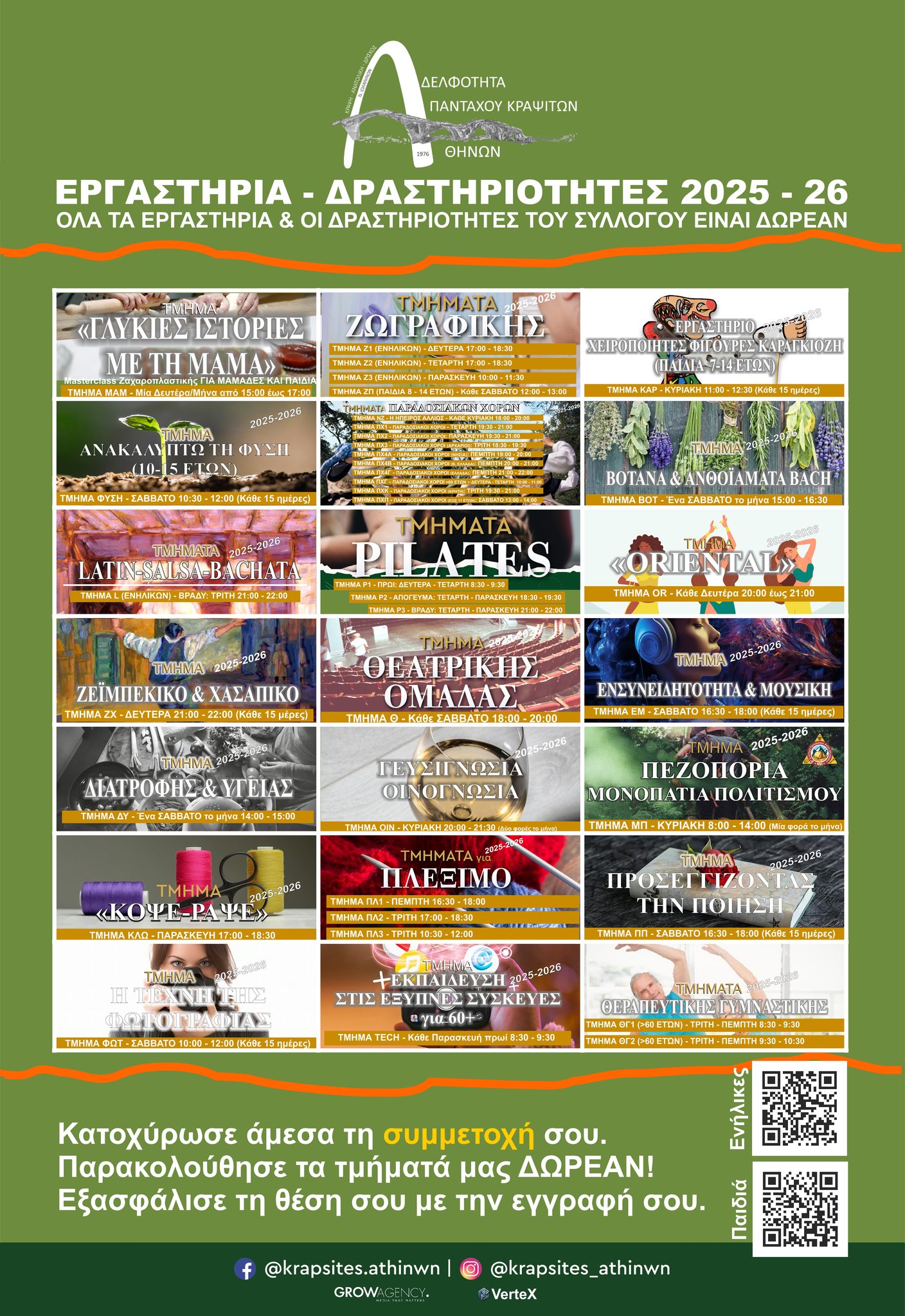 Η Αδελφότητα Απανταχού Κραψιτών Αθηνών διοργανώνει και φέτος εργαστήρια για μικρούς και για μεγάλους για τη χρονιά 2025-2026. Ο πυρήνας του σχεδιασμού των εργαστηρίων 2025-2026, βασίζεται σε ένα όραμα ανοιχτό, συμμετοχικό και χωρίς αποκλεισμούς.