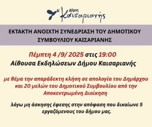 Το Δημοτικό Συμβούλιο του Δήμου Καισαριανής καλεί έκτακτη Ανοιχτή Συνεδρίαση την Πέμπτη, 4 Σεπτεμβρίου 2025 και ώρα 19:00, στην Αίθουσα Εκδηλώσεων Δήμου Καισαριανής με μοναδικό θέμα συζήτησης «την απαράδεκτη κλήση σε απολογία του Δημάρχου και 20 μελών του Δημοτικού Συμβουλίου Καισαριανής», λόγω μη άσκησης έφεσης στις αποφάσεις των δικαστηρίων με τις οποίες δικαιώνονταν οι 5 εργαζόμενοι στην καθαριότητα.