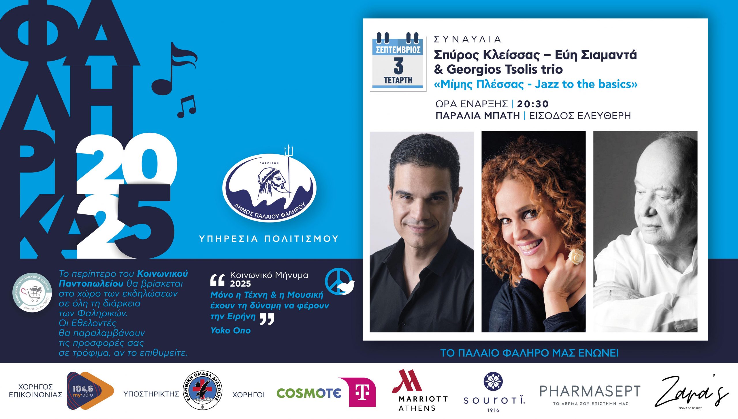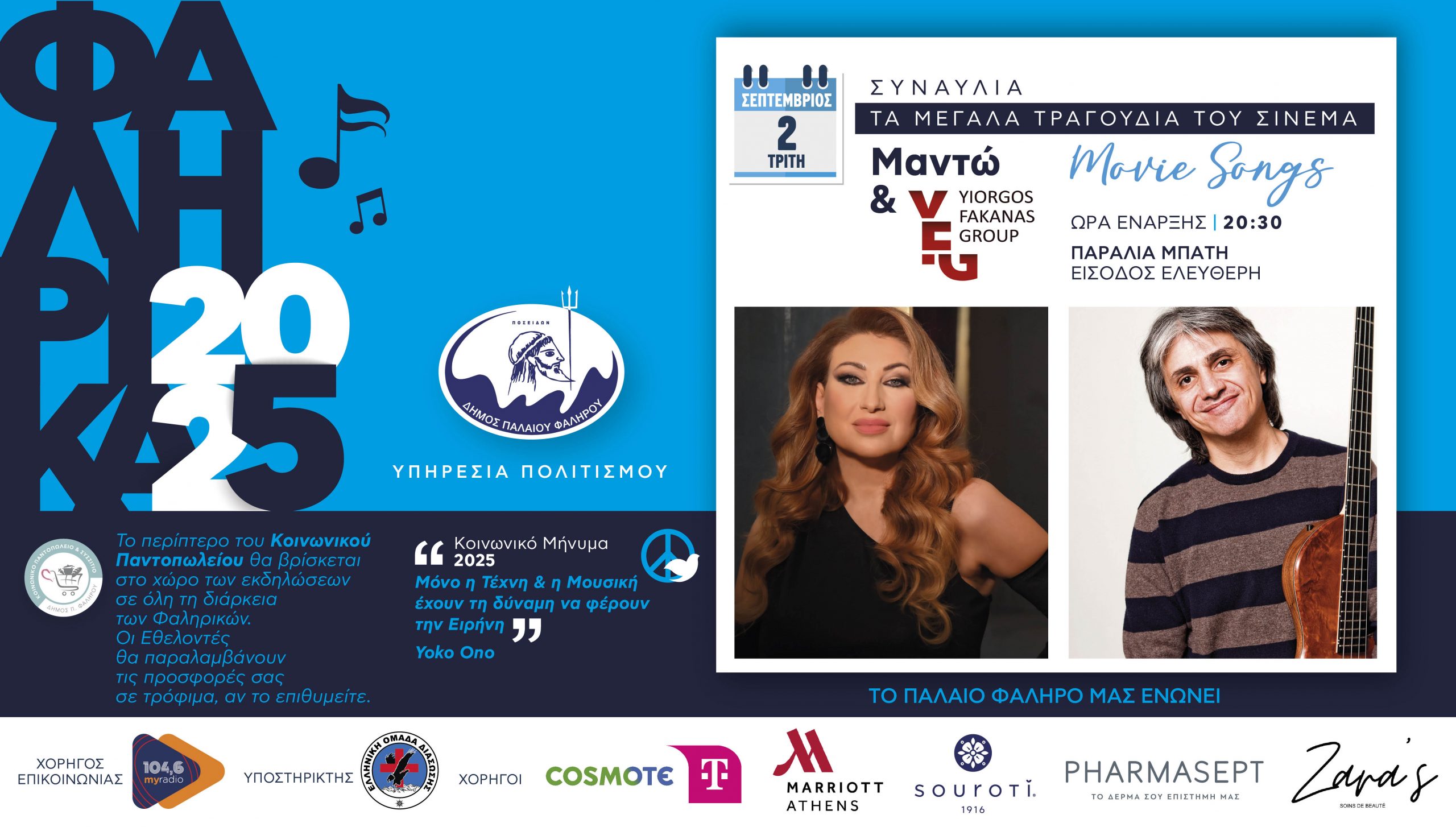 Έγινε μεγάλη προσπάθεια να έχουμε ελεύθερη είσοδο για το κοινό αλλά πραγματικά θέλω να σας παρακαλέσω όσοι επιλέξετε να βρεθείτε κοντά μας αντί εισιτηρίου να προσφέρετε τρόφιμα για τους ωφελούμενους των Κοινωνικών Δομών του Δήμου μας , που πιστέψτε με το έχουν ανάγκη. Ας διασκεδάσουμε αλλά ας βάλουμε όλοι μαζί ένα στόχο και ας τον υλοποιήσουμε προς όφελος των συνανθρώπων μας. Αναπόσπαστο κομμάτι της ψυχής μας οι τέχνες, ακόμα σπουδαιότερη η τέχνη της ενσυναίσθησης. Με το βλέμμα στραμμένο σε μια ποιοτική καθημερινότητα των κατοίκων της πόλης μας ευελπιστούμε τα ¨Φαληρικά 2025¨ να αποτελέσουν το ιδανικό ξεκίνημα για το Φθινόπωρο.