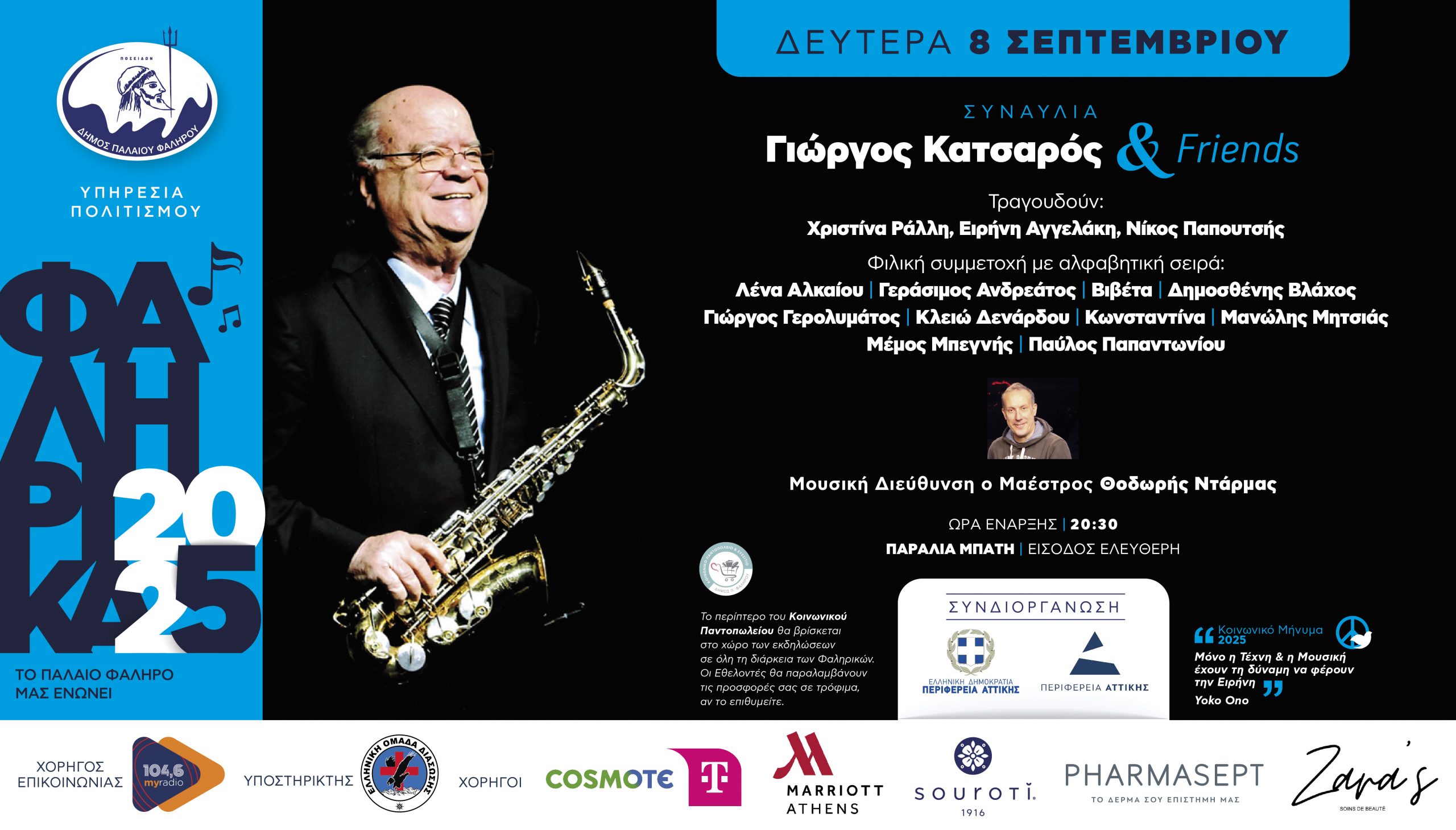 Ξεχωριστή θέση στα φετινά Φαληρικά έχει η συναυλία του σπουδαίου δημιουργού Γιώργου Κατσαρού. Το Παλαιό Φάληρο τιμά τον τεράστιο Μαέστρο με την αδιάλειπτη προσφορά του στον πολιτισμό, που θα δώσει το παρών, πάντα με το σαξόφωνό του παρέα.