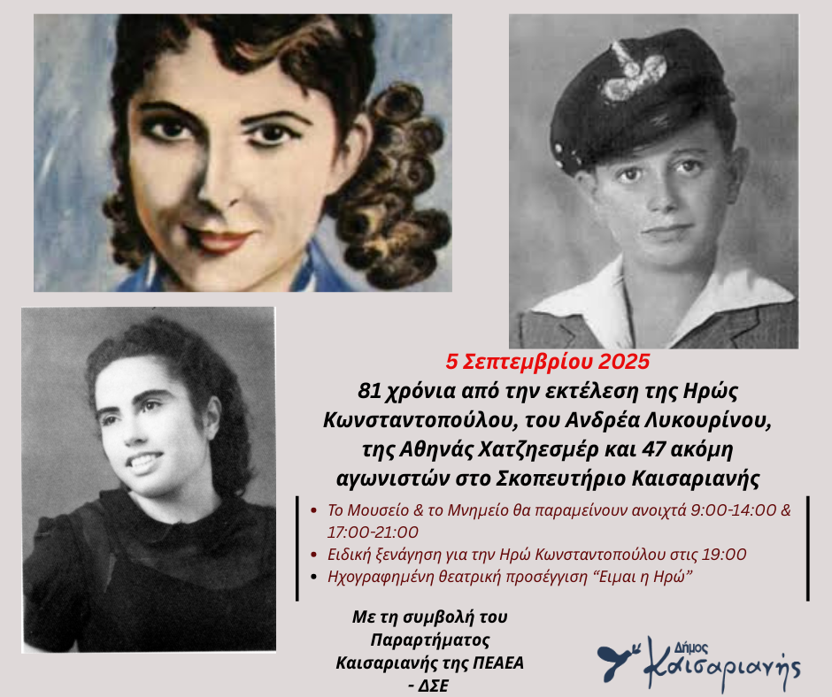Την Τρίτη 5 Σεπτεμβρίου 1944, στο Σκοπευτήριο Καισαριανής εκτελούνται από τους Γερμανούς 50 αγωνιστές της Αντίστασης, ανάμεσα στους οποίους βρίσκονταν και οι μικρότεροι σε ηλικία, Ανδρέας Λυκουρίνος 14 ετών, Ηρώ Κωνσταντοπούλου 17 ετών και Αθηνά Χατζηεσμέρ 20 ετών.