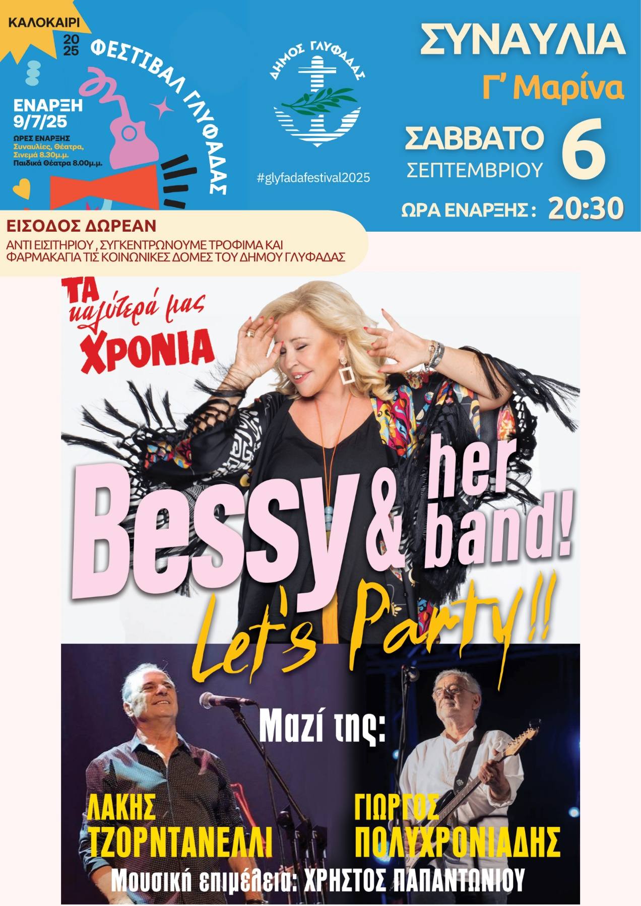Η Μπέσσυ Αργυράκη έρχεται στο Φεστιβάλ Γλυφάδας να κάνει χαμό! Με το αστείρευτο κέφι, τη ζωντάνια και τη θετική της ενέργεια, στοιχεία που παραμένουν αναλλοίωτα στο χρόνο, η θρυλική τραγουδίστρια της ελληνικής ποπ ζωντανεύει τα «Καλύτερά μας Χρόνια», μέσα από τη μουσική των δεκαετιών που έκανε τις ντίσκο να παίρνουν φωτιά. Από τα 60’s στα 90’s και στο σήμερα, η Μπέσσυ Αργυράκη με τη μπάντα της διαπερνούν όλη την ελληνική ποπ μουσική, αλλά δεν περιορίζονται εκεί.
