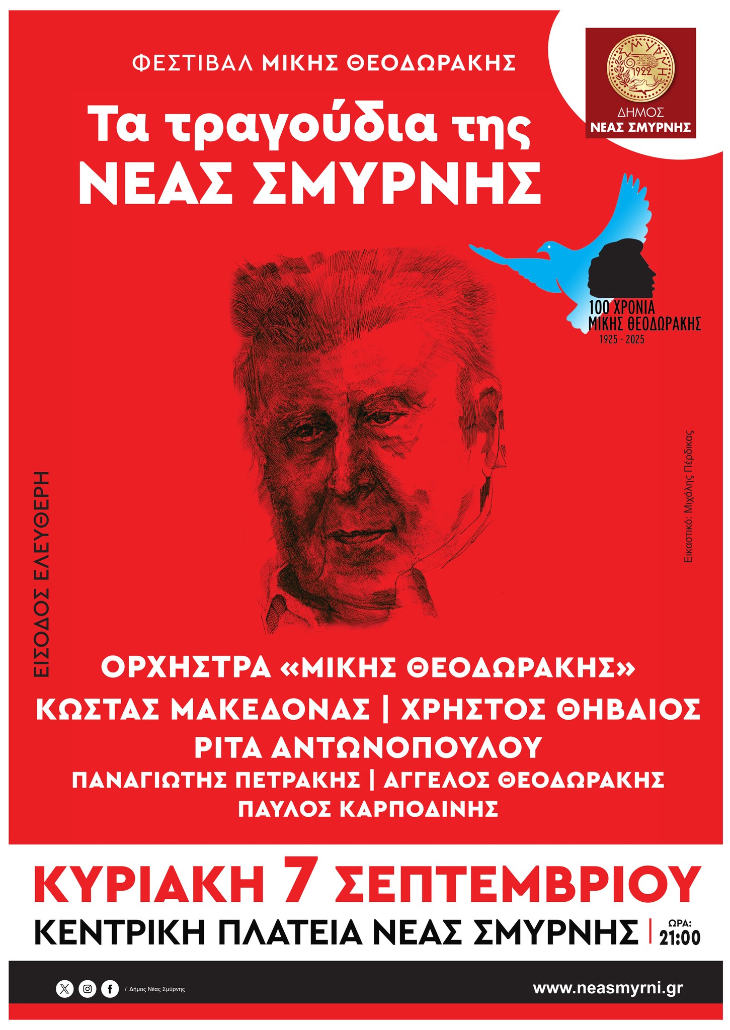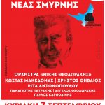 Η πρώτη συναυλία στο πλαίσιο του Φεστιβάλ «Μίκης Θεοδωράκης», που πραγματοποιείται από το Δήμο Νέας Σμύρνης, για την συμπλήρωση 100 χρόνων από την γέννηση του κορυφαίου Έλληνα συνθέτη, πραγματοποιείται την Κυριακή 7 Σεπτεμβρίου, ώρα 21:00, στην Κεντρική Πλατεία.