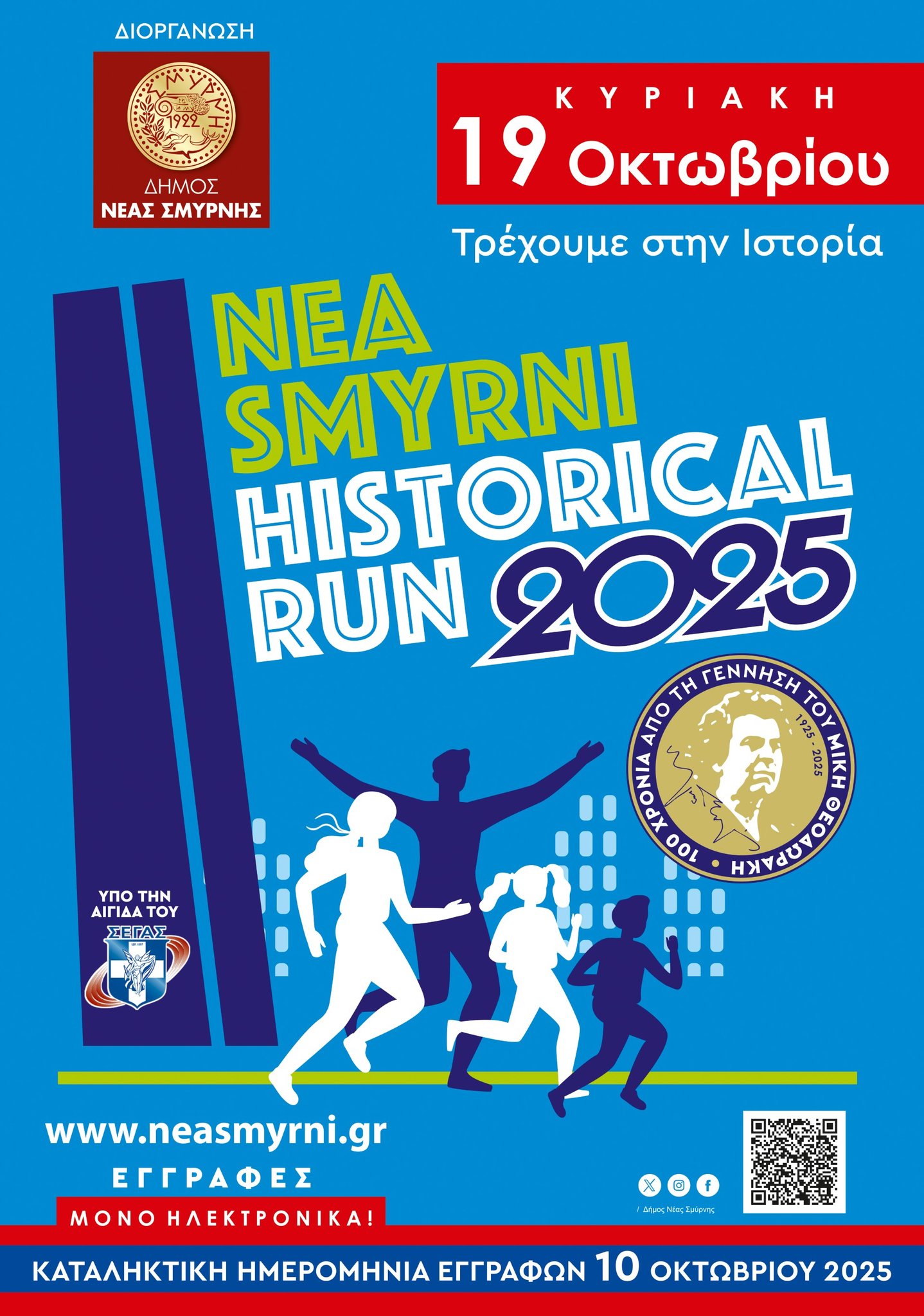 Ο καθιερωμένος αγώνας Ιστορικής Μνήμης, «Nea Smyrni Historic Run 2025» θα πραγματοποιηθεί την Κυριακή 19 Οκτωβρίου στους δρόμους της πόλης. Η πλατφόρμα για τις εγγραφές έχει ανοίξει και οι ενδιαφερόμενοι μπορούν να δηλώσουν συμμετοχή εδώ.