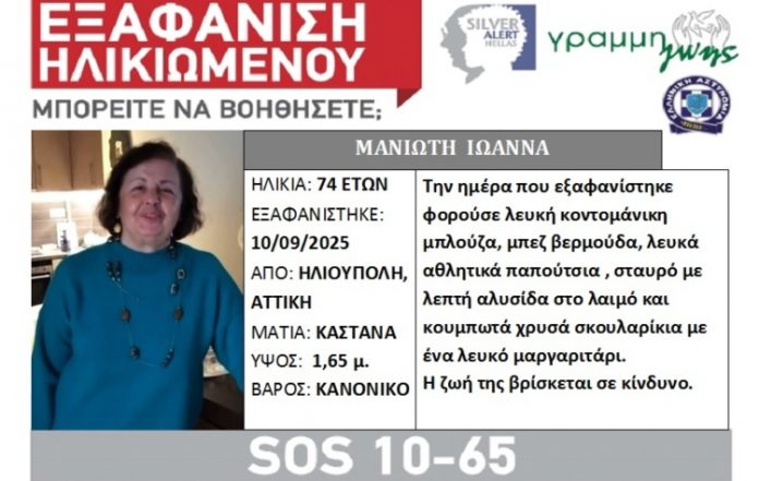 Η Ιωάννα Μανιώτη, 74 ετών, εξαφανίστηκε από το σπίτι της, στην Ηλιούπολη Αττικής, το μεσημέρι της 10/09/25.
