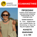 Συναγερμός σήμανε στη «Γραμμή Ζωής» για την εξαφάνιση μίας 74χρονης γυναίκας από την Ηλιούπολη, με τον Δήμο να ζητά τη συνεργασία και τη βοήθεια όλων των πολιτών.