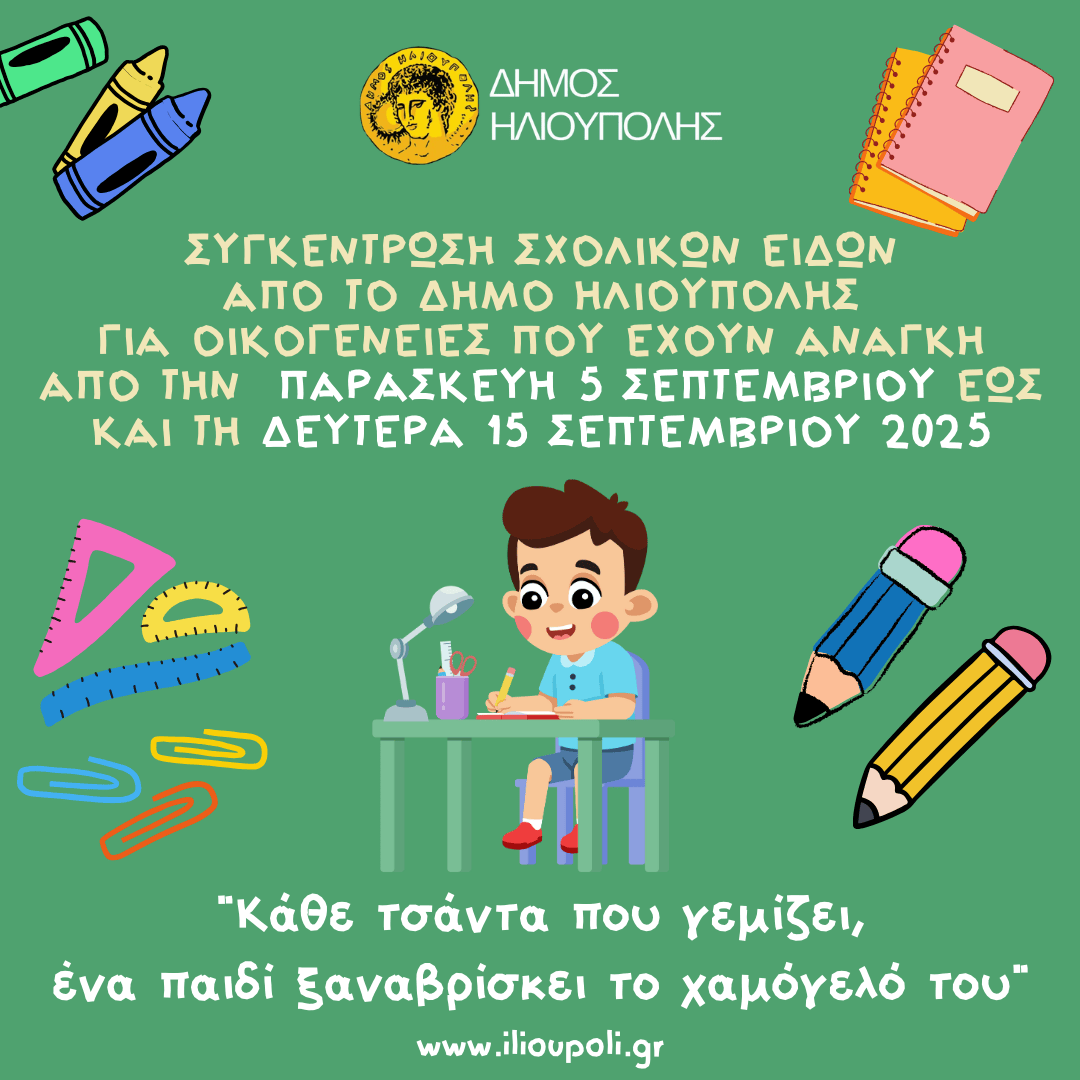 O Δήμος Ηλιούπολης, ενόψει της νέας σχολικής χρονιάς και με αίσθημα ευθύνης απέναντι στις οικογένειες που έχουν ανάγκη, συγκεντρώνει σχολικά είδη προκειμένου κάθε μαθητής να έχει τα απαραίτητα για το σχολείο.