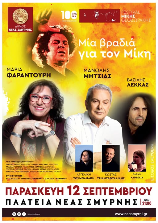 Ο συναυλιακός κύκλος του Φεστιβάλ «Μίκης Θεοδωράκης» του Δήμου Νέας Σμύρνης κλείνει την Παρασκευή 12 Σεπτεμβρίου με την με την τρίτη και τελευταία συναυλία στην Κεντρική Πλατεία υπό τον τίτλο «Μια βραδιά για τον Μίκη».