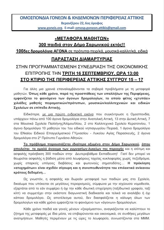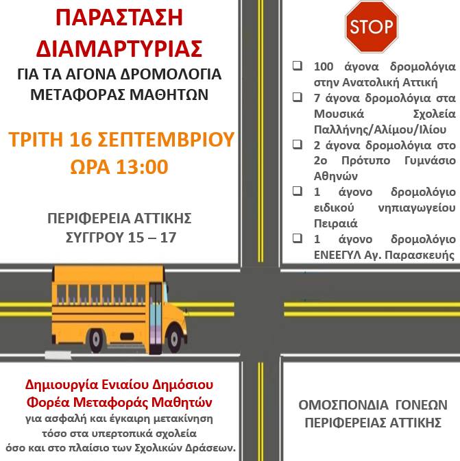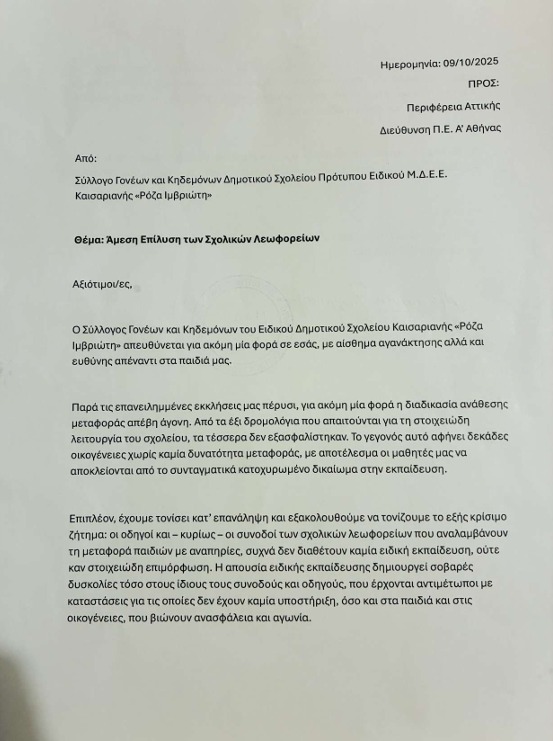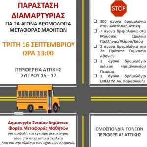 Ο Σύλλογος Γονέων & Κηδεμόνων του Ειδικού Σχολείου «Ρόζα Ιμβριώτη» Καισαριανής συμμετέχει στην κινητοποίηση που διοργανώνει την Τρίτη 16 Σεπτεμβρίου, στις 13:00, η Ομοσπονδία Γονέων Αττικής για το μείζον ζήτημα της μεταφοράς μαθητών, «με αίσθημα αγανάκτησης αλλά και ευθύνης απέναντι στα παιδιά».