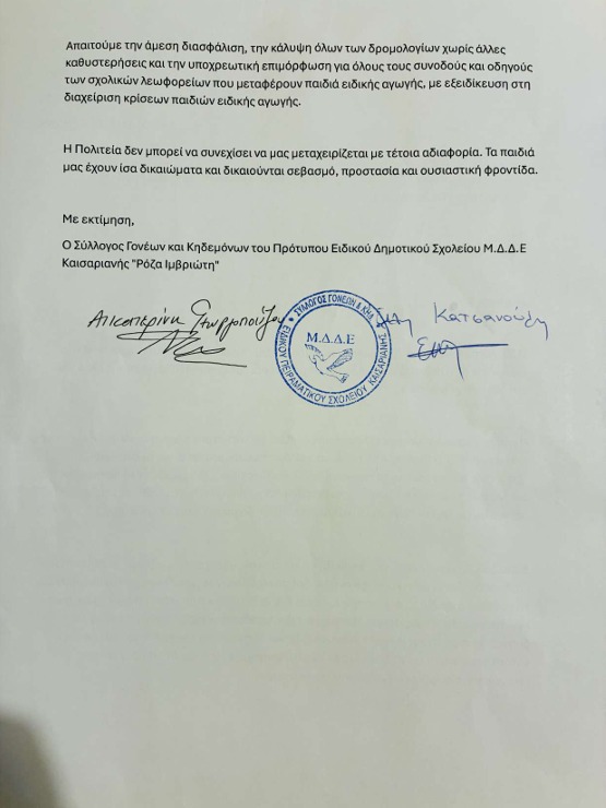 Η Δημοτική Αρχή Καισαριανής στηρίζει τον Σύλλογο Γονέων & Κηδεμόνων «Ρόζα Ιμβριώτη» και συμμετέχει επίσης στην κινητοποίηση για το μείζον ζήτημα της μεταφοράς μαθητών.