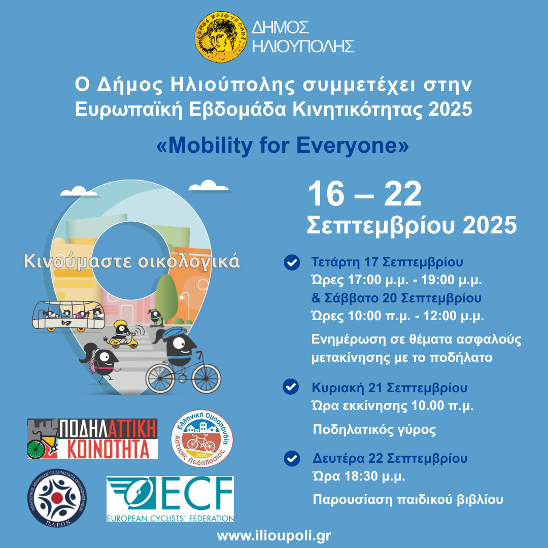 Ο Δήμος Ηλιούπολης συμμετέχει ενεργά στην «Ευρωπαϊκή Εβδομάδα Κινητικότητας 2025» με θέμα «Mobility for Everyone – Κινητικότητα για Όλους», διοργανώνοντας σε συνεργασία με την ΠοδηλΑΤΤΙΚΗ Κοινότητα και τον Πολιτιστικό Αθλητικό Οργανισμό ΠΑΡΟΝ και την υποστήριξη της Ελληνικής Ομοσπονδίας Αστικής Ποδηλασίας και της European Cyclists Federation, τις εξής δράσεις: