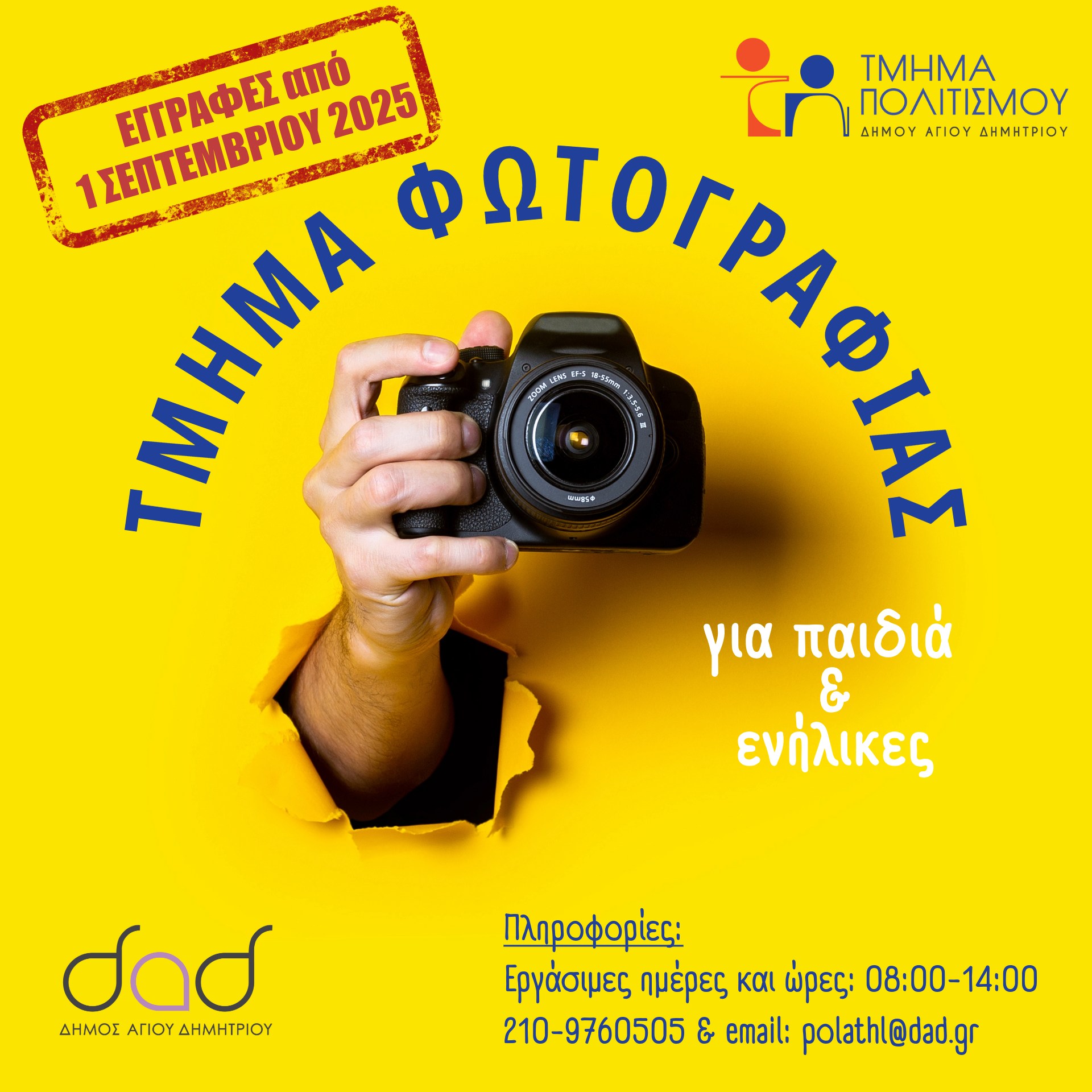 Τα μαθήματα φωτογραφίας για παιδιά και ενήλικες από το Τμήμα Πολιτισμού του Δήμου Αγίου Δημητρίου για τη νέα σχολική χρονιά έχουν ξεκινήσει από την 1η Σεπτεμβρίου.