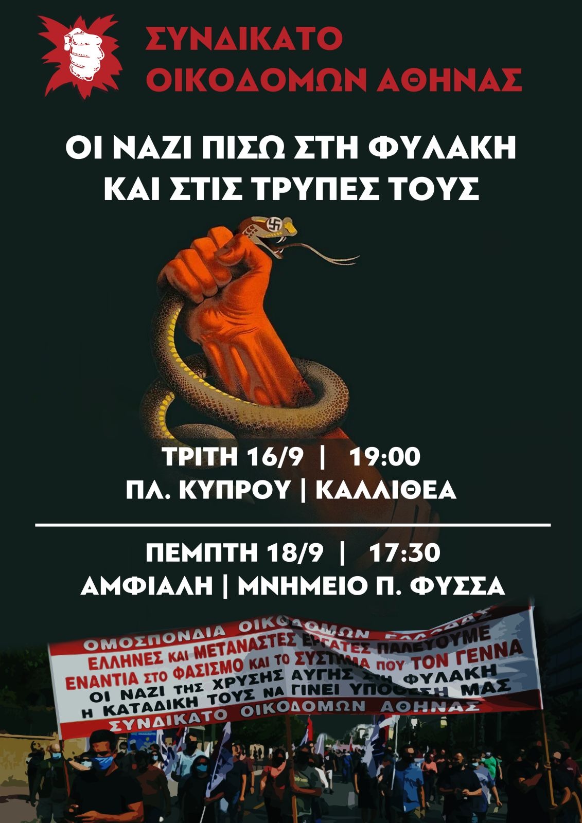 Το Συνδικάτο Οικοδόμων Αθήνας και το Παράρτημα Καλλιθέας, καλούν τα Σωματεία του κλάδου, τους φορείς την νεολαία της περιοχής, σε συλλαλητήριο την Τρίτη 16 Σεπτέμβρη στις 19.00 στην πλατεία Κύπρου, με απαίτηση την αναίρεση της απόφασης του Συμβουλίου Πλημμελειοδικών Λαμίας, με την οποία αποφυλακίζεται για «λόγους υγείας», το ηγετικό στέλεχος της Χρυσής Αυγής, ο ναζιστής εγκληματίας Ν. Μιχαλολιάκος.