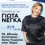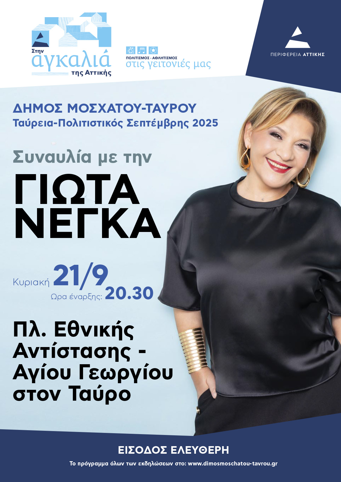 • Κυριακή 21 Σεπτεμβρίου, πλ. Εθνικής Αντίστασης (Αγίου Γεωργίου)-Ταύρος, 20.30: Συναυλία με την Γιώτα Νέγκα (Συνδιοργάνωση με την Περιφέρεια Αττικής)