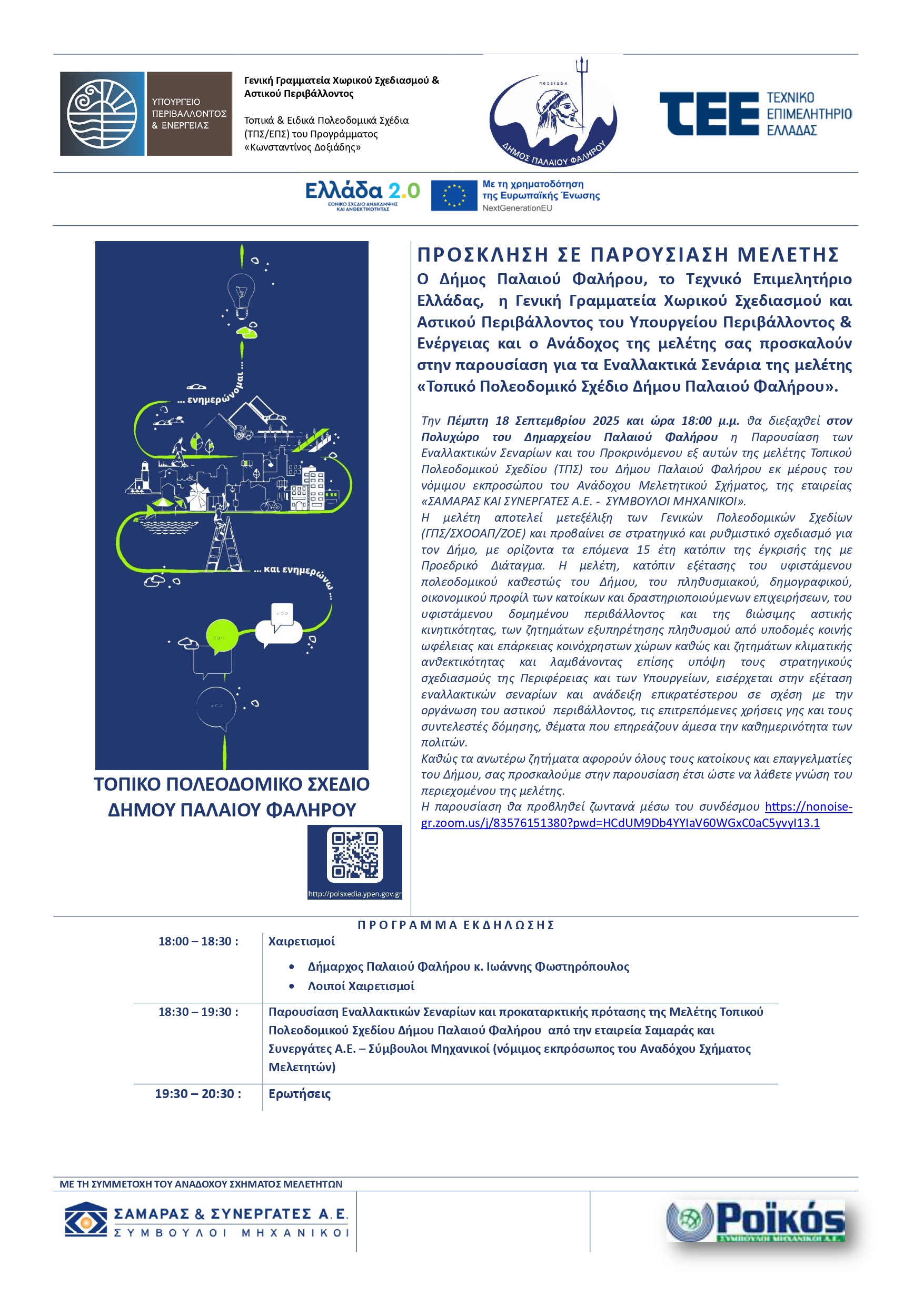 18:30-19:30: Παρουσίαση Εναλλακτικών Σεναρίων και προκαταρκτικής πρότασης της Μελέτης Τοπικού Πολεοδομικού Σχεδίου Δήμου Παλαιού Φαλήρου από την εταιρεία Σαμαράς και Συνεργάτες Α.Ε. – Σύμβουλοι Μηχανικοί (νόμιμος εκπρόσωπος του Αναδόχου Σχήματος Μελετητών)