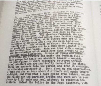 «…Το σχέδιο ήταν το ίδιο και στη Σμύρνη… επιθέσεις εναντίον των Ελλήνων αξιωματικών στο αρχηγείο του ΝΑΤΟ. Το ελληνικό Προξενείο, η κύρια ελληνική Εκκλησία, οι ελληνικοί δρόμοι, ιδιωτικά σπίτια και καθετί το ελληνικό είχαν υποστεί επίθεση, καεί ή καταστραφεί…».