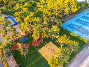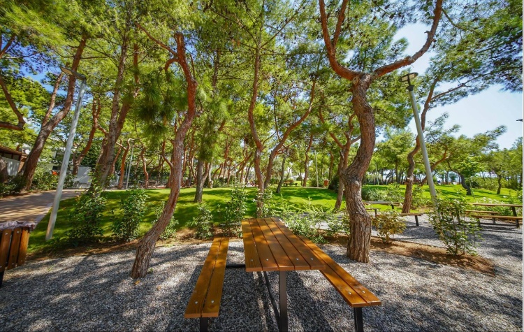 Πράσινο παντού, ένας κατάφυτος χώρος (στα πεύκα που υπήρχαν, προσθέσαμε χιλιάδες νέα φυτά και μεγάλα δέντρα). Γηπεδάκια τένις για τα παιδιά. Μικρό γήπεδο ποδοσφαίρου. Χώροι για παιχνίδι και για άθληση. Πίστα pumptrack για ποδήλατα και σκέιτμπορντ. Διαδρομές περιπάτου. Όργανα γυμναστικής για τους μεγαλύτερους. Παιδική χαρά. «Έξυπνα» παγκάκια και χώροι αναψυχής. Φωτισμός με φωτοβολταϊκά. Και αρκετές ακόμα καινοτομίες, που αξίζει να δείτε από κοντά.